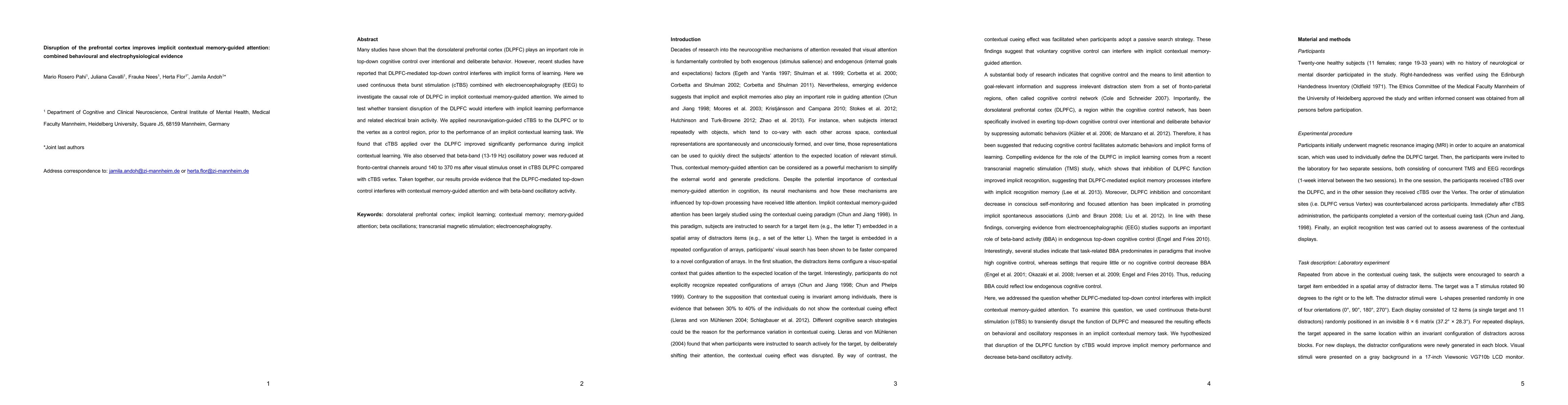 Many studies have shown that the dorsolateral prefrontal cortex (DLPFC) plays an important role in top-down cognitive control over intentional and deliberate behavior. However, recent studies have reported that DLPFC-mediated top-down control interferes with implicit forms of learning. Here we used continuous theta burst stimulation (cTBS) combined with electroencephalography (EEG) to investigate the causal role of DLPFC in implicit contextual memory-guided attention. We aimed to test whether transient disruption of the DLPFC would interfere with implicit learning performance and related electrical brain activity. We applied neuronavigation-guided cTBS to the DLPFC or to the vertex as a control region prior to the performance of an implicit contextual learning task. We found that cTBS applied over the DLPFC significantly improved performance during implicit contextual learning. We also noted that beta-band (13-19 Hz) oscillatory power was reduced at fronto-central channels about 140 to 370 ms after visual stimulus onset in cTBS DLPFC compared with cTBS vertex. Taken together, our results provide evidence that DLPFC-mediated top-down control interferes with contextual memory-guided attention and beta-band oscillatory activity.
