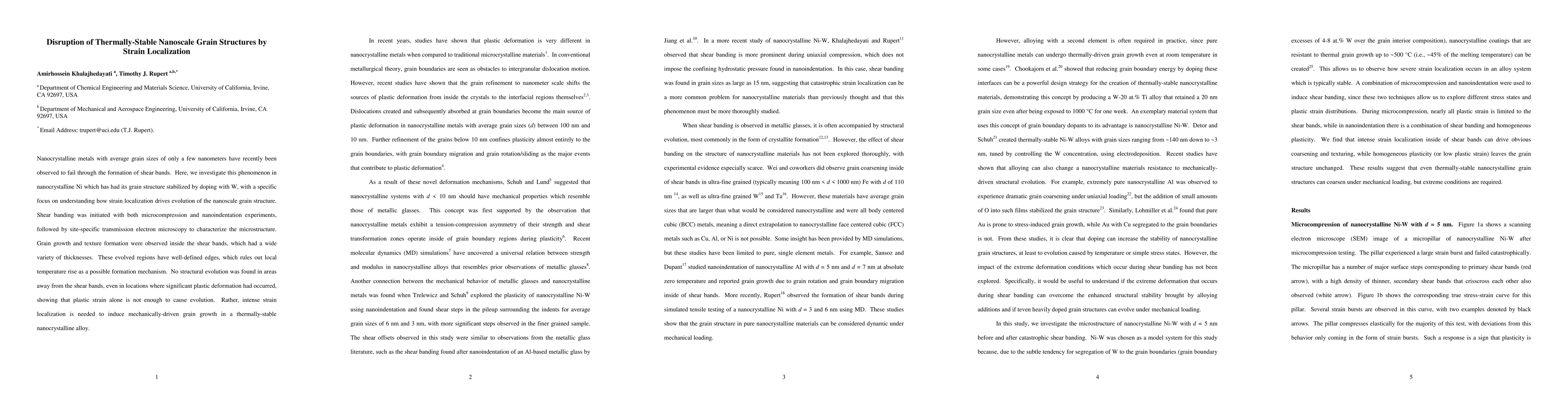 This study investigates the failure mechanism in thermally-stable nanocrystalline Ni through shear banding induced by strain localization, revealing that intense strain localization, rather than plastic deformation alone, drives the evolution and grain growth within these shear bands.