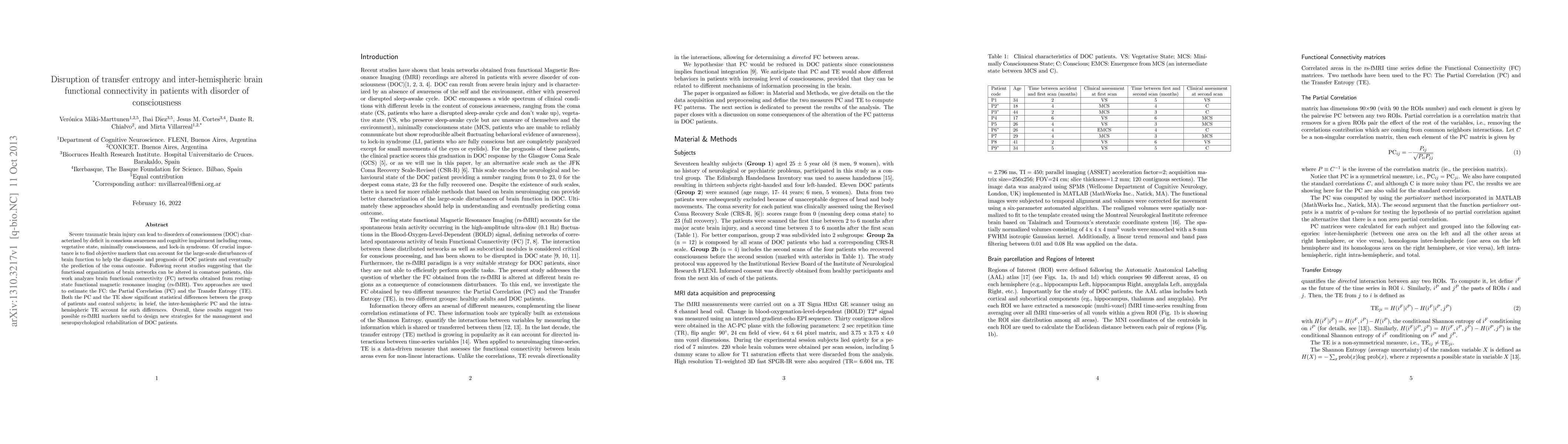 Severe traumatic brain injury can lead to disorders of consciousness (DOC) characterized by deficit in conscious awareness and cognitive impairment including coma, vegetative state, minimally consciousness, and lock-in syndrome. Of crucial importance is to find objective markers that can account for the large-scale disturbances of brain function to help the diagnosis and prognosis of DOC patients and eventually the prediction of the coma outcome. Following recent studies suggesting that the functional organization of brain networks can be altered in comatose patients, this work analyzes brain functional connectivity (FC) networks obtained from resting-state functional magnetic resonance imaging (rs-fMRI). Two approaches are used to estimate the FC: the Partial Correlation (PC) and the Transfer Entropy (TE). Both the PC and the TE show significant statistical differences between the group of patients and control subjects; in brief, the inter-hemispheric PC and the intra-hemispheric TE account for such differences. Overall, these results suggest two possible rs-fMRI markers useful to design new strategies for the management and neuropsychological rehabilitation of DOC patients.