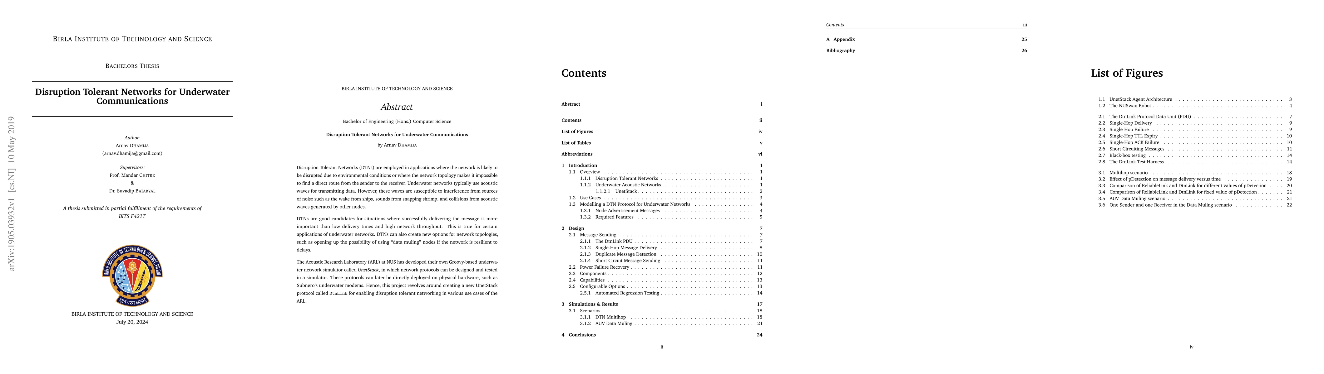 This paper explores the application of Disruption Tolerant Networks (DTNs) in underwater acoustic communication, addressing the challenges posed by environmental noise and disruption. The DtnLink protocol, developed using the UnetStack simulator, aims to enhance data delivery reliability despite network delays and interference.