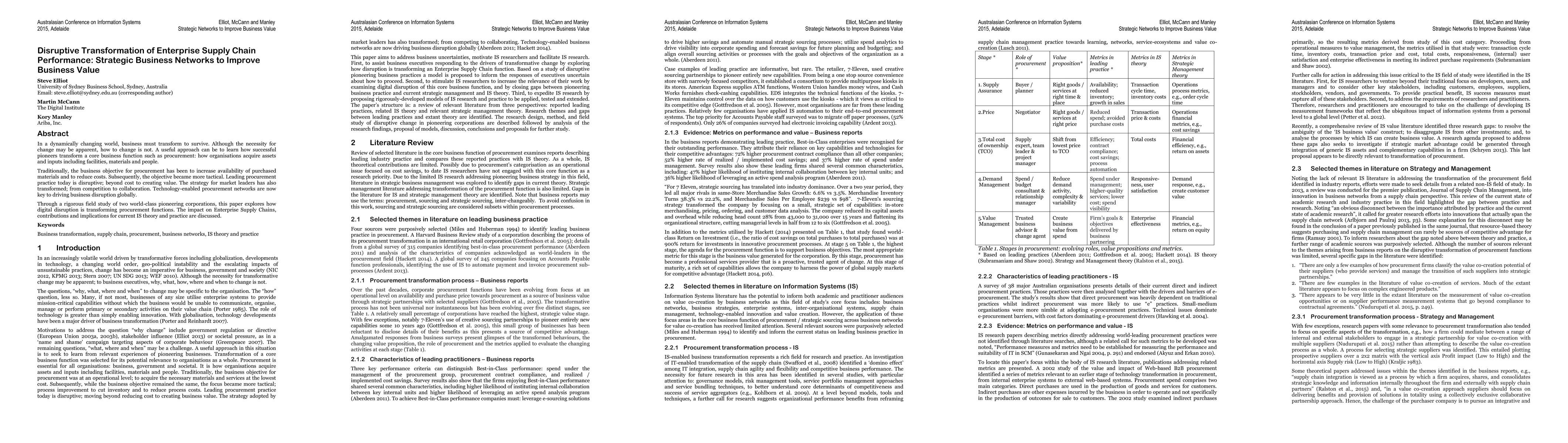 A study on two world-class corporations reveals how technology-enabled business networks are transforming Enterprise Supply Chains to create value beyond cost reduction. The research explores the shift from competition to collaboration in procurement strategies and its implications for current IS theory and practice.