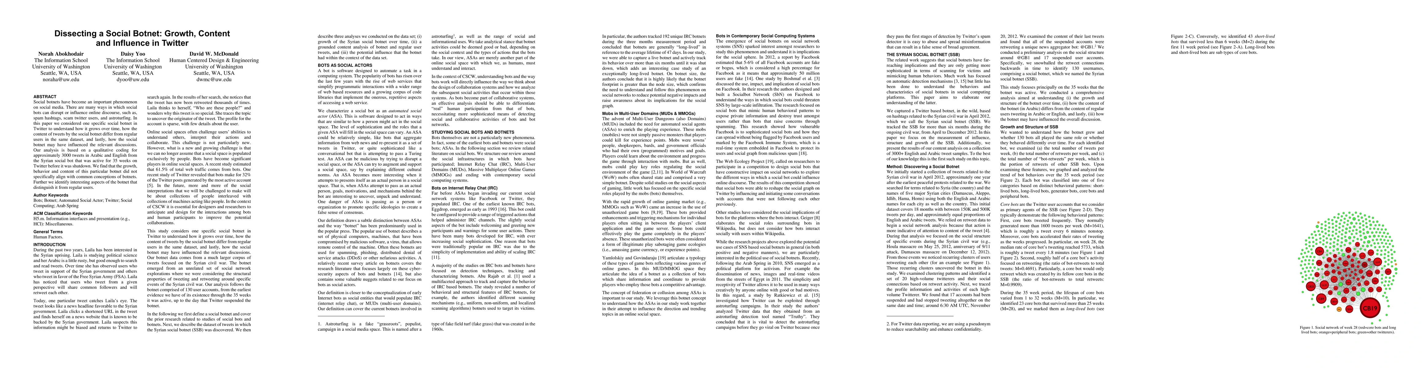 Social botnets have become an important phenomenon on social media. There are many ways in which social bots can disrupt or influence online discourse, such as, spam hashtags, scam twitter users, and astroturfing. In this paper we considered one specific social botnet in Twitter to understand how it grows over time, how the content of tweets by the social botnet differ from regular users in the same dataset, and lastly, how the social botnet may have influenced the relevant discussions. Our analysis is based on a qualitative coding for approximately 3000 tweets in Arabic and English from the Syrian social bot that was active for 35 weeks on Twitter before it was shutdown. We find that the growth, behavior and content of this particular botnet did not specifically align with common conceptions of botnets. Further we identify interesting aspects of the botnet that distinguish it from regular users.