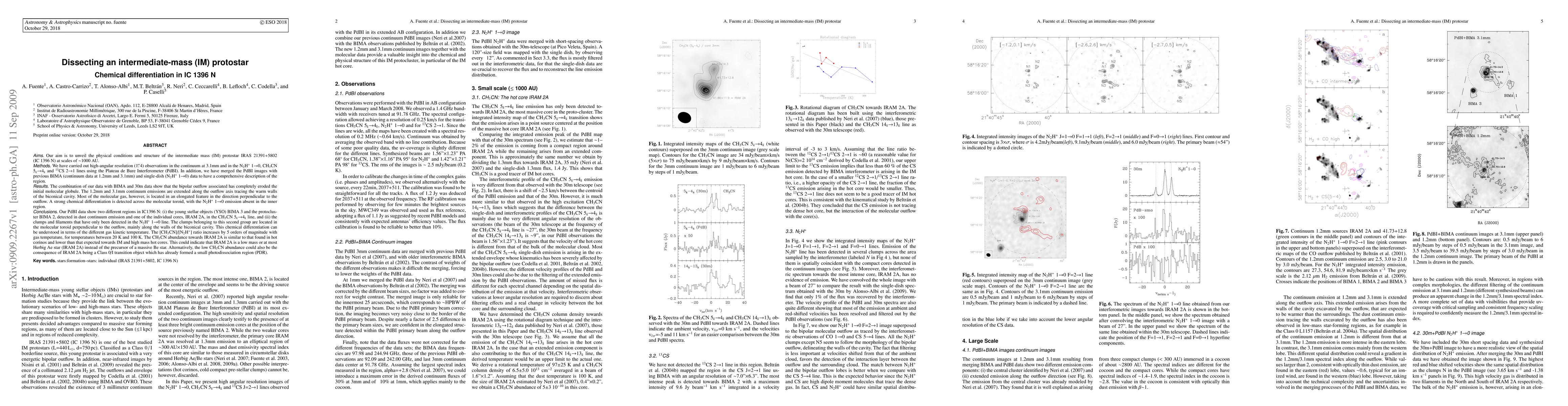 We have carried out high-angular resolution (1.4") observations in the continuum at 3.1mm and in the N2H+ 1-0, CH3CN 5_k-4_k and 13CS 2-1 lines using the Plateau de Bure Interferometer (PdBI) towards the intermediate mass (IM) protostar IRAS21391+5802 (IC1396N). In addition, we have merged the PdBI images with previous BIMA (continuum data at 1.2mm and 3.1mm) and single-dish (N2H+ 1-0) data to have a comprehensive description of the region. The combination of our data with BIMA and 30m data show that the bipolar outflow associated has completely eroded the initial molecular globule. The 1.2mm and 3.1mm continuum emissions are extended along the outflow axis tracing the warm walls of the biconical cavity. Most of the molecular gas, however, is located in an elongated feature in the direction perpendicular to the outflow. A strong chemical differentiation is detected across the molecular toroid, with the N2H+ 1-0 emission absent in the inner region.This chemical differentiation can be understood in terms of the different gas kinetic temperature. The [CH3CN]/[N2H+] ratio increases by 5 orders of magnitude with gas temperature, for temperatures between 20K and 100K. The CH3CN abundance towards IRAM 2A, the most massive protostellar core, is similar to that found in hot corinos and lower than that expected towards IM and high mass hot cores. This could indicate that IRAM 2A is a low mass or at most Herbig Ae star (IRAM 2A) instead of the precursor of a massive Be star. Alternatively, the low CH3CN abundance could also be the consequence of IRAM 2A being a Class 0/I transition object which has already formed a small photodissociation region (PDR).