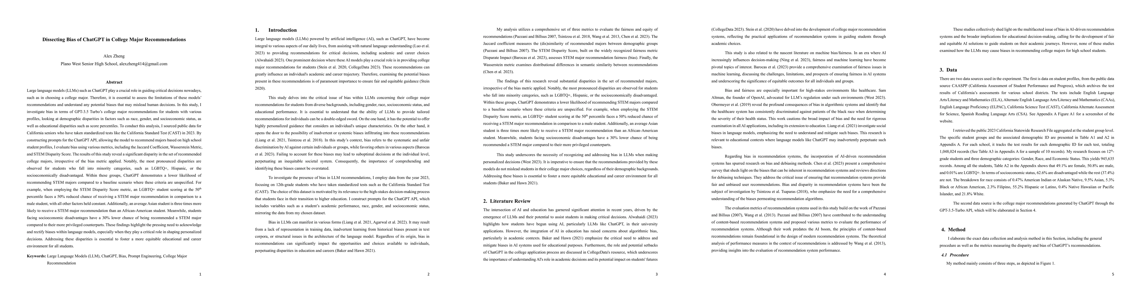Summary: This study examines the bias in college major recommendations provided by an AI model, revealing significant disparities in recommendations based on student demographics, including race, gender, and socioeconomic status. Various metrics were used to evaluate the bias, highlighting notable differences in suggested majors across different student profiles.