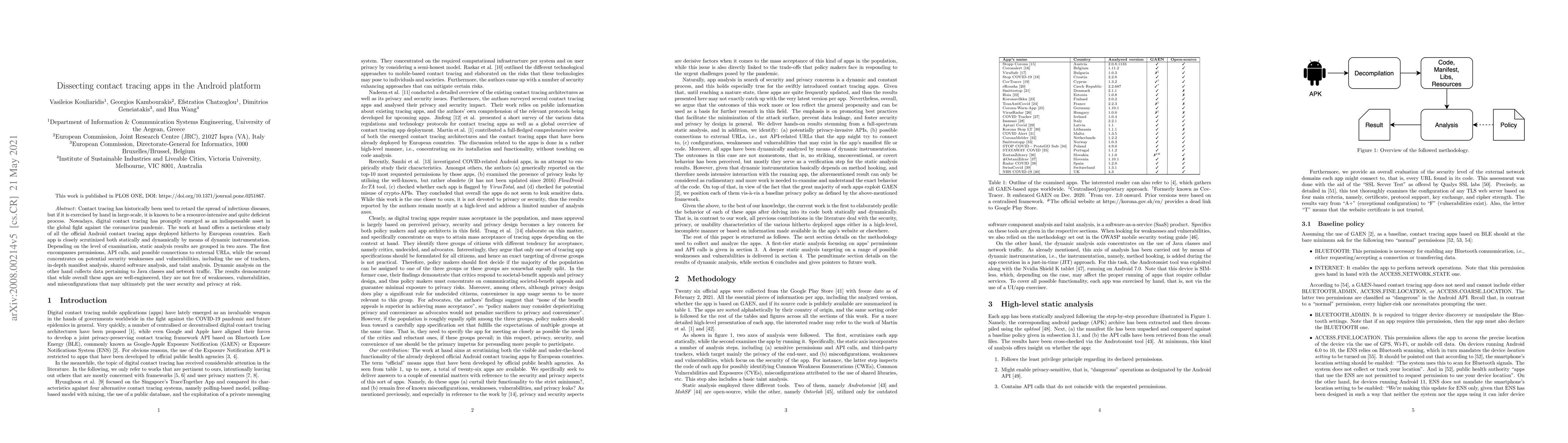 The study meticulously analyzed all official Android contact tracing apps deployed by European countries, using static and dynamic analysis techniques, including Mobile Security Framework (MobSF) and Ostorlab tool, to examine permissions, API calls, network traffic, and third-party trackers.