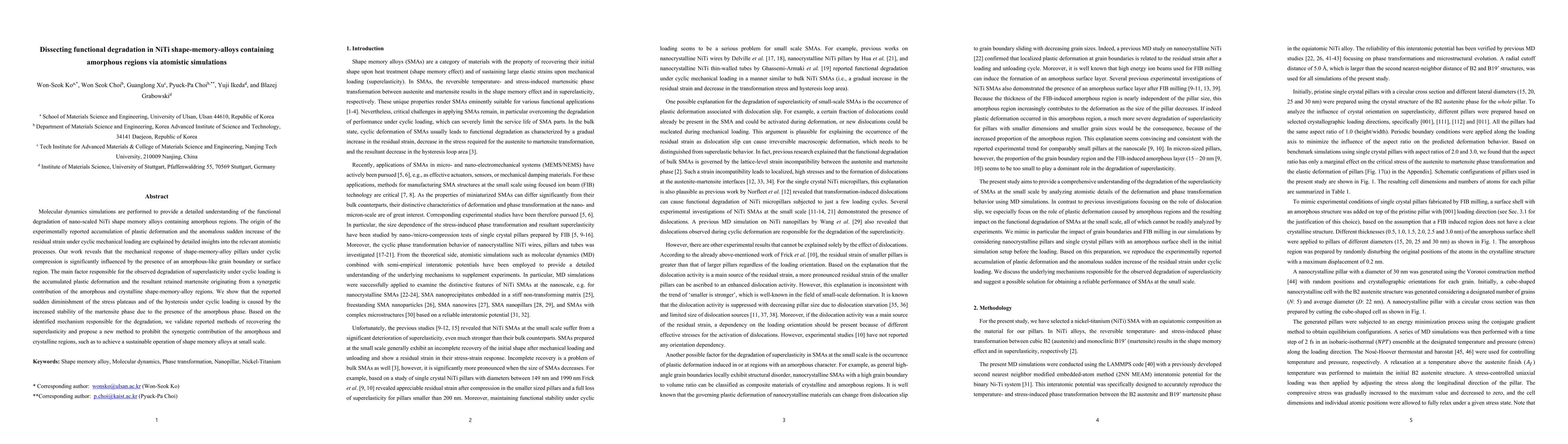 This paper uses molecular dynamics simulations to explore the functional degradation of NiTi shape-memory alloys with amorphous regions, revealing that the presence of amorphous regions significantly affects mechanical response under cyclic loading. The study identifies accumulated plastic deformation and increased martensite stability as the main factors leading to the degradation of superelasticity, suggesting new methods to mitigate these effects.