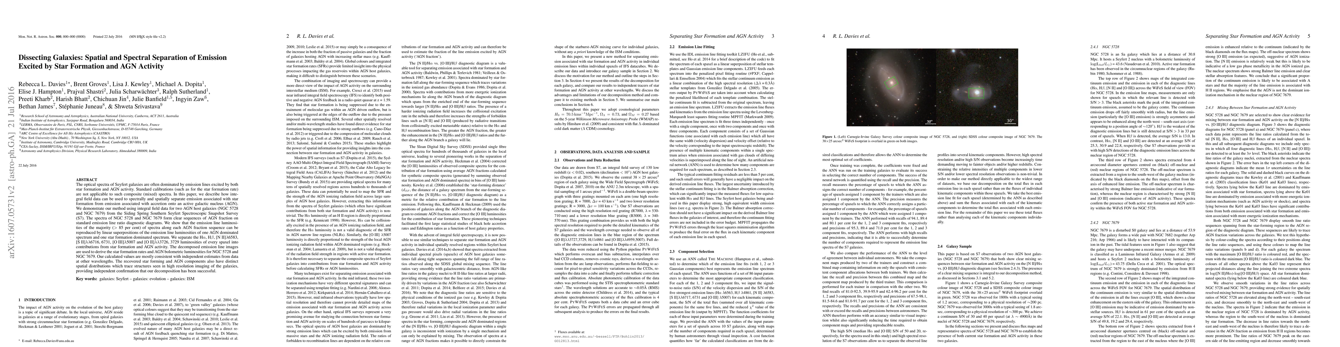 This paper presents a method for spatially and spectrally separating emission lines in Seyfert galaxies caused by star formation and active galactic nucleus (AGN) activity using integral field data. The method successfully decomposes emission lines in two AGN host galaxies, revealing distinct spatial distributions and consistent star formation rates and AGN luminosities.