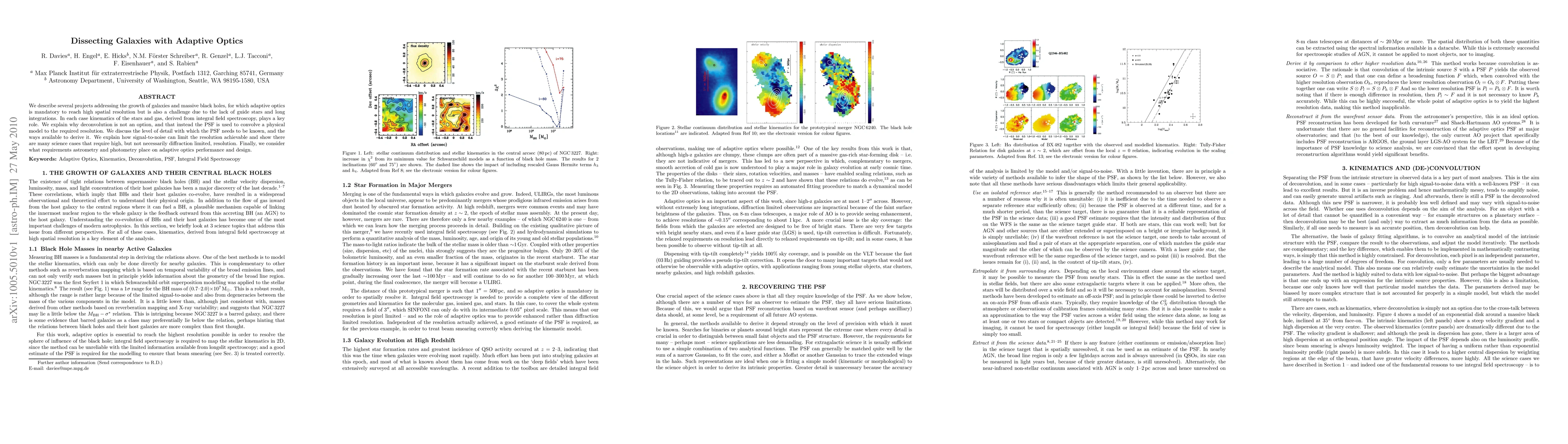 This paper explores adaptive optics projects focused on the growth of galaxies and their central black holes, emphasizing the necessity of high spatial resolution despite challenges. It highlights the use of integral field spectroscopy for star and gas kinematics, the importance of convolving physical models with the point spread function (PSF) instead of deconvolution, and discusses the impact of signal-to-noise on achievable resolution, alongside the requirements for astrometry and photometry in adaptive optics design.