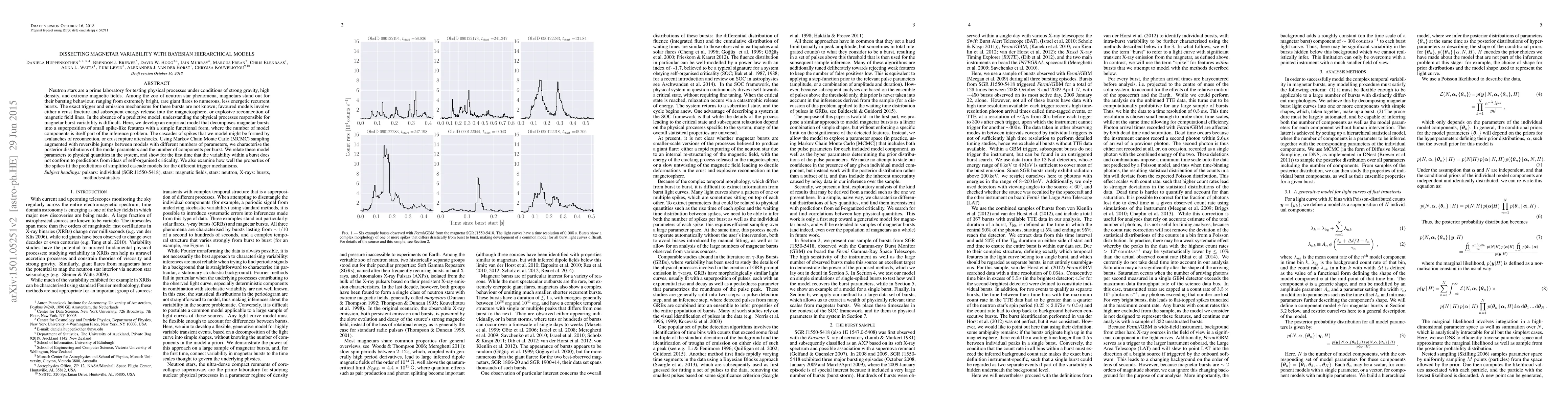 Neutron stars are a prime laboratory for testing physical processes under conditions of strong gravity, high density, and extreme magnetic fields. Among the zoo of neutron star phenomena, magnetars stand out for their bursting behaviour, ranging from extremely bright, rare giant flares to numerous, less energetic recurrent bursts. The exact trigger and emission mechanisms for these bursts are not known; favoured models involve either a crust fracture and subsequent energy release into the magnetosphere, or explosive reconnection of magnetic field lines. In the absence of a predictive model, understanding the physical processes responsible for magnetar burst variability is difficult. Here, we develop an empirical model that decomposes magnetar bursts into a superposition of small spike-like features with a simple functional form, where the number of model components is itself part of the inference problem. The cascades of spikes that we model might be formed by avalanches of reconnection, or crust rupture aftershocks. Using Markov Chain Monte Carlo (MCMC) sampling augmented with reversible jumps between models with different numbers of parameters, we characterise the posterior distributions of the model parameters and the number of components per burst. We relate these model parameters to physical quantities in the system, and show for the first time that the variability within a burst does not conform to predictions from ideas of self-organised criticality. We also examine how well the properties of the spikes fit the predictions of simplified cascade models for the different trigger mechanisms.