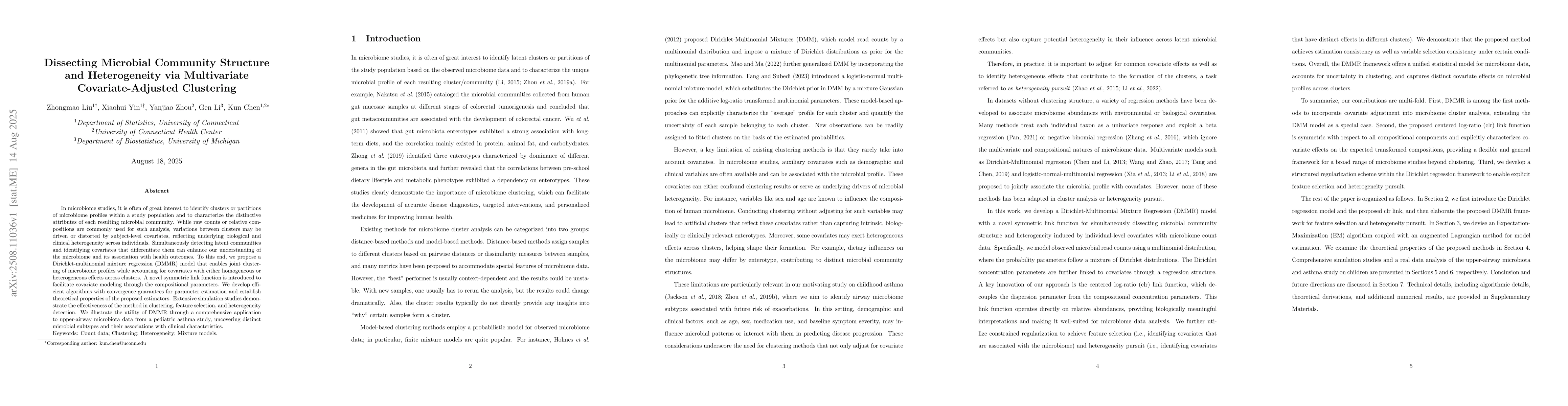 In microbiome studies, it is often of great interest to identify clusters or partitions of microbiome profiles within a study population and to characterize the distinctive attributes of each resulting microbial community. While raw counts or relative compositions are commonly used for such analysis, variations between clusters may be driven or distorted by subject-level covariates, reflecting underlying biological and clinical heterogeneity across individuals. Simultaneously detecting latent communities and identifying covariates that differentiate them can enhance our understanding of the microbiome and its association with health outcomes. To this end, we propose a Dirichlet-multinomial mixture regression (DMMR) model that enables joint clustering of microbiome profiles while accounting for covariates with either homogeneous or heterogeneous effects across clusters. A novel symmetric link function is introduced to facilitate covariate modeling through the compositional parameters. We develop efficient algorithms with convergence guarantees for parameter estimation and establish theoretical properties of the proposed estimators. Extensive simulation studies demonstrate the effectiveness of the method in clustering, feature selection, and heterogeneity detection. We illustrate the utility of DMMR through a comprehensive application to upper-airway microbiota data from a pediatric asthma study, uncovering distinct microbial subtypes and their associations with clinical characteristics.