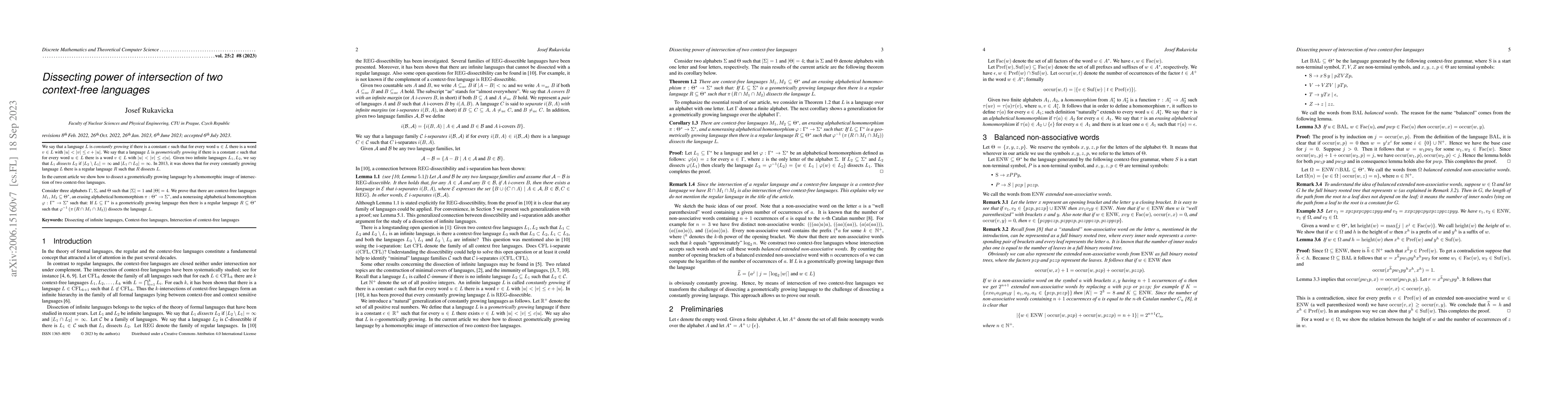 We say that a language $L$ is \emph{constantly growing} if there is a constant $c$ such that for every word $u\in L$ there is a word $v\in L$ with $\vert u\vert<\vert v\vert\leq c+\vert u\vert$. We say that a language $L$ is \emph{geometrically growing} if there is a constant $c$ such that for every word $u\in L$ there is a word $v\in L$ with $\vert u\vert<\vert v\vert\leq c\vert u\vert$. Given two infinite languages $L_1,L_2$, we say that $L_1$ \emph{dissects} $L_2$ if $\vert L_2\setminus L_1\vert=\infty$ and $\vert L_1\cap L_2\vert=\infty$. In 2013, it was shown that for every constantly growing language $L$ there is a regular language $R$ such that $R$ dissects $L$. In the current article we show how to dissect a geometrically growing language by a homomorphic image of intersection of two context-free languages. Consider three alphabets $\Gamma$, $\Sigma$, and $\Theta$ such that $\vert \Sigma\vert=1$ and $\vert \Theta\vert=4$. We prove that there are context-free languages $M_1,M_2\subseteq \Theta^*$, an erasing alphabetical homomorphism $\pi:\Theta^*\rightarrow \Sigma^*$, and a nonerasing alphabetical homomorphism $\varphi : \Gamma^*\rightarrow \Sigma^*$ such that: If $L\subseteq \Gamma^*$ is a geometrically growing language then there is a regular language $R\subseteq \Theta^*$ such that $\varphi^{-1}\left(\pi\left(R\cap M_1\cap M_2\right)\right)$ dissects the language $L$.