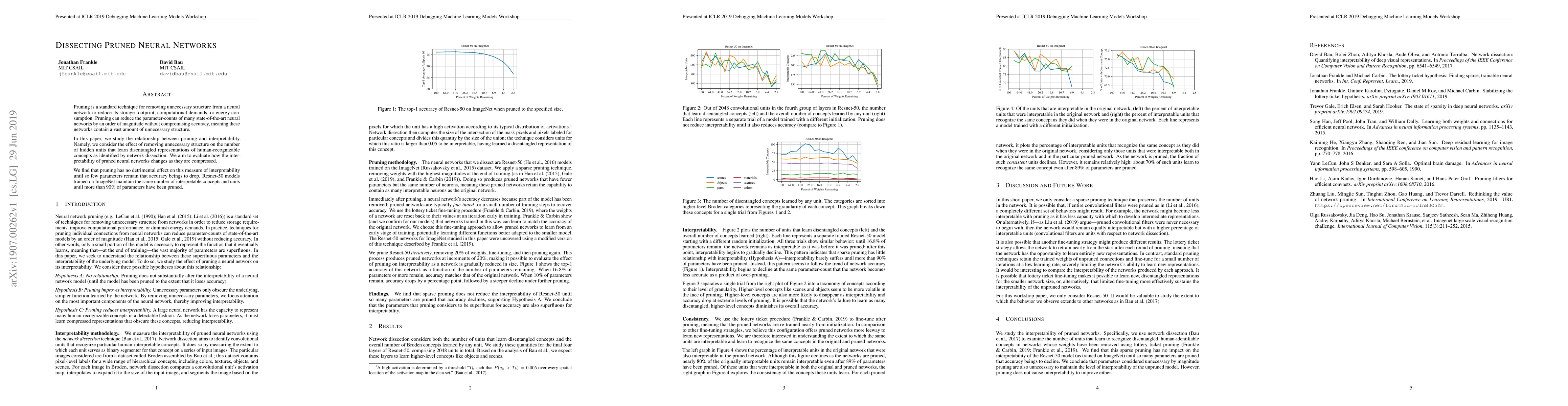 Pruning is a standard technique for removing unnecessary structure from a neural network to reduce its storage footprint, computational demands, or energy consumption. Pruning can reduce the parameter-counts of many state-of-the-art neural networks by an order of magnitude without compromising accuracy, meaning these networks contain a vast amount of unnecessary structure. In this paper, we study the relationship between pruning and interpretability. Namely, we consider the effect of removing unnecessary structure on the number of hidden units that learn disentangled representations of human-recognizable concepts as identified by network dissection. We aim to evaluate how the interpretability of pruned neural networks changes as they are compressed. We find that pruning has no detrimental effect on this measure of interpretability until so few parameters remain that accuracy beings to drop. Resnet-50 models trained on ImageNet maintain the same number of interpretable concepts and units until more than 90% of parameters have been pruned.