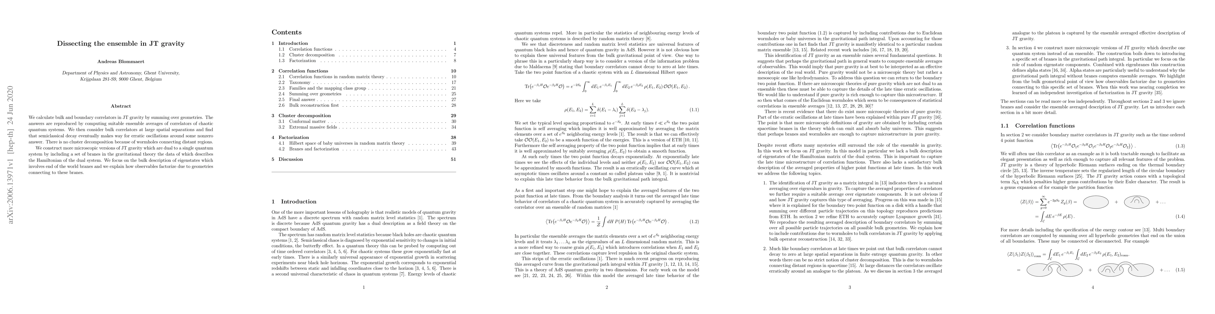 We calculate bulk and boundary correlators in JT gravity by summing over geometries. The answers are reproduced by computing suitable ensemble averages of correlators of chaotic quantum systems. We then consider bulk correlators at large spatial separations and find that semiclassical decay eventually makes way for erratic oscillations around some nonzero answer. There is no cluster decomposition because of wormholes connecting distant regions. We construct more microscopic versions of JT gravity which are dual to a single quantum system by including a set of branes in the gravitational theory the data of which describes the Hamiltonian of the dual system. We focus on the bulk description of eigenstates which involves end of the world branes and we explain how observables factorize due to geometries connecting to these branes.