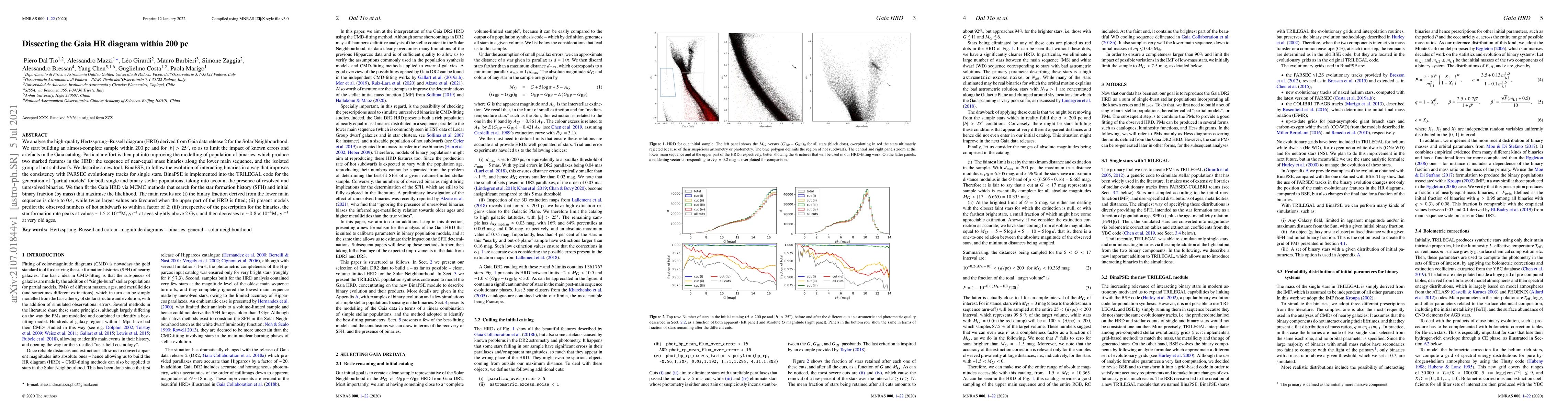 This study analyzes Gaia DR2 data to construct a high-quality Hertzsprung-Russell diagram for the Solar Neighbourhood within 200 pc. It introduces BinaPSE, a tool to model binary star evolution, integrated into TRILEGAL for generating stellar population models. The research finds a lower main sequence binary fraction around 0.4, larger values (nearly 0.8) in the upper HRD, and accurately predicts hot subdwarf numbers. The star formation rate peaks at 1.5e-4 Msun/yr, ages around 2 Gyr, and decreases to 0.8e-4 Msun/yr at older ages.