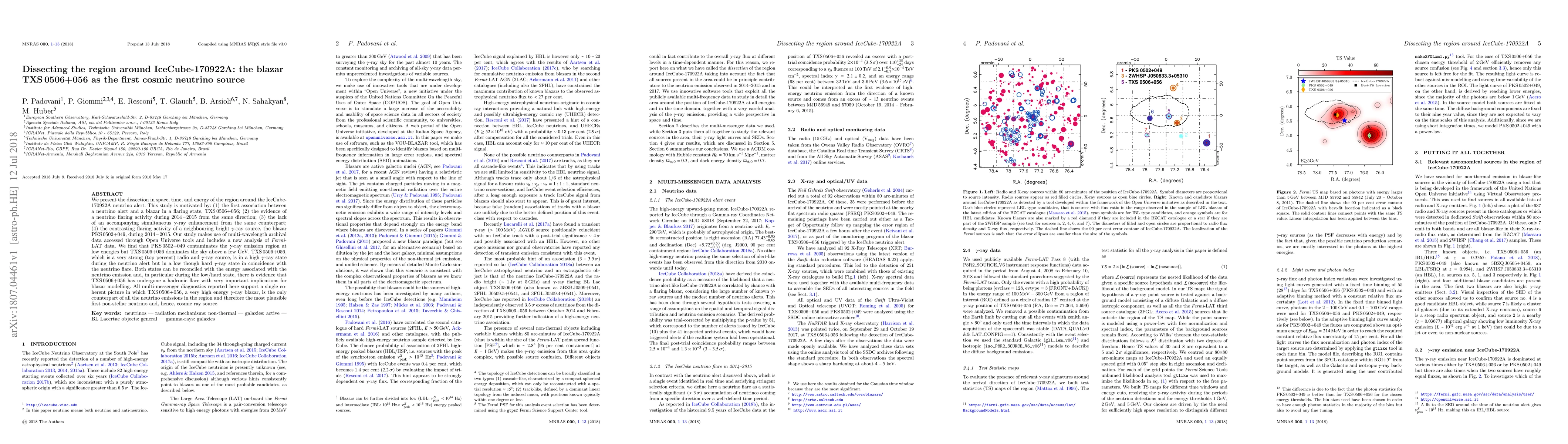 We present the dissection in space, time, and energy of the region around the IceCube-170922A neutrino alert. This study is motivated by: (1) the first association between a neutrino alert and a blazar in a flaring state, TXS 0506+056; (2) the evidence of a neutrino flaring activity during 2014 - 2015 from the same direction; (3) the lack of an accompanying simultaneous $\gamma$-ray enhancement from the same counterpart; (4) the contrasting flaring activity of a neighbouring bright $\gamma$-ray source, the blazar PKS 0502+049, during 2014 - 2015. Our study makes use of multi-wavelength archival data accessed through Open Universe tools and includes a new analysis of Fermi-LAT data. We find that PKS 0502+049 contaminates the $\gamma$-ray emission region at low energies but TXS 0506+056 dominates the sky above a few GeV. TXS 0506+056, which is a very strong (top percent) radio and $\gamma$-ray source, is in a high $\gamma$-ray state during the neutrino alert but in a low though hard $\gamma$-ray state in coincidence with the neutrino flare. Both states can be reconciled with the energy associated with the neutrino emission and, in particular during the low/hard state, there is evidence that TXS 0506+056 has undergone a hadronic flare with very important implications for blazar modelling. All multi-messenger diagnostics reported here support a single coherent picture in which TXS 0506+056, a very high energy $\gamma$-ray blazar, is the only counterpart of all the neutrino emissions in the region and therefore the most plausible first non-stellar neutrino and, hence, cosmic ray source.
