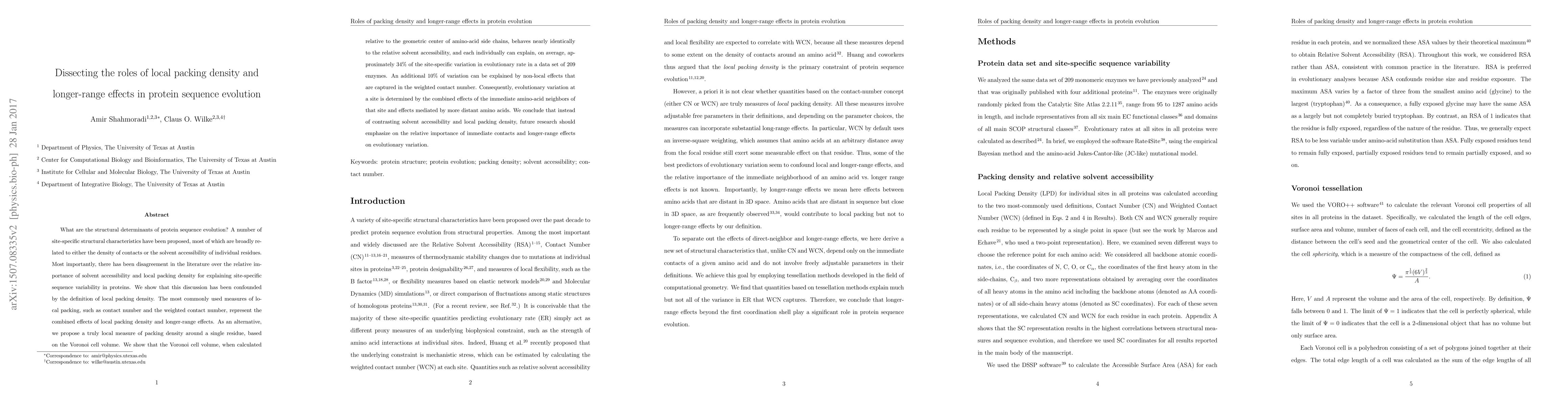 What are the structural determinants of protein sequence evolution? A number of site-specific structural characteristics have been proposed, most of which are broadly related to either the density of contacts or the solvent accessibility of individual residues. Most importantly, there has been disagreement in the literature over the relative importance of solvent accessibility and local packing density for explaining site-specific sequence variability in proteins. We show here that this discussion has been confounded by the definition of local packing density. The most commonly used measures of local packing, such as the contact number and the weighted contact number, represent by definition the combined effects of local packing density and longer-range effects. As an alternative, we here propose a truly local measure of packing density around a single residue, based on the Voronoi cell volume. We show that the Voronoi cell volume, when calculated relative to the geometric center of amino-acid side chains, behaves nearly identically to the relative solvent accessibility, and both can explain, on average, approximately 34\% of the site-specific variation in evolutionary rate in a data set of 209 enzymes. An additional 10\% of variation can be explained by non-local effects that are captured in the weighted contact number. Consequently, evolutionary variation at a site is determined by the combined action of the immediate amino-acid neighbors of that site and of effects mediated by more distant amino acids. We conclude that instead of contrasting solvent accessibility and local packing density, future research should emphasize the relative importance of immediate contacts and longer-range effects on evolutionary variation.
