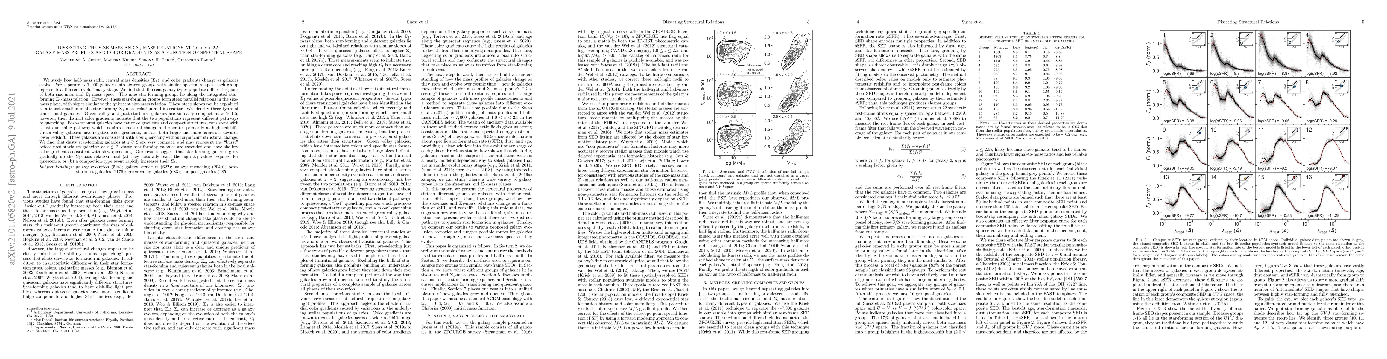 We study how half-mass radii, central mass densities ($\Sigma_1$), and color gradients change as galaxies evolve. We separate $\sim7,000$ galaxies into sixteen groups with similar spectral shapes; each group represents a different evolutionary stage. We find that different galaxy types populate different regions of both size-mass and $\Sigma_1$-mass space. The nine star-forming groups lie along the integrated star-forming $\Sigma_1$-mass relation. However, these star-forming groups form steep parallel relations in the size-mass plane, with slopes similar to the quiescent size-mass relation. These steep slopes can be explained as a transformation of the star-forming $\Sigma_1$-mass relation and its scatter. We identify three types of transitional galaxies. Green valley and post-starburst galaxies are similarly compact at $z>1.5$; however, their distinct color gradients indicate that the two populations represent different pathways to quenching. Post-starburst galaxies have flat color gradients and compact structures, consistent with a fast quenching pathway which requires structural change and operates primarily at high redshift. Green valley galaxies have negative color gradients, and are both larger and more numerous towards lower redshift. These galaxies are consistent with slow quenching without significant structural change. We find that dusty star-forming galaxies at $z\gtrsim2$ are very compact, and may represent the "burst" before post-starburst galaxies; at $z\lesssim2$, dusty star-forming galaxies are extended and have shallow color gradients consistent with slow quenching. Our results suggest that star-forming galaxies grow gradually up the \sig-mass relation until (a) they naturally reach the high $\Sigma_1$ values required for quiescence, or (b) a compaction-type event rapidly increases their $\Sigma_1$.