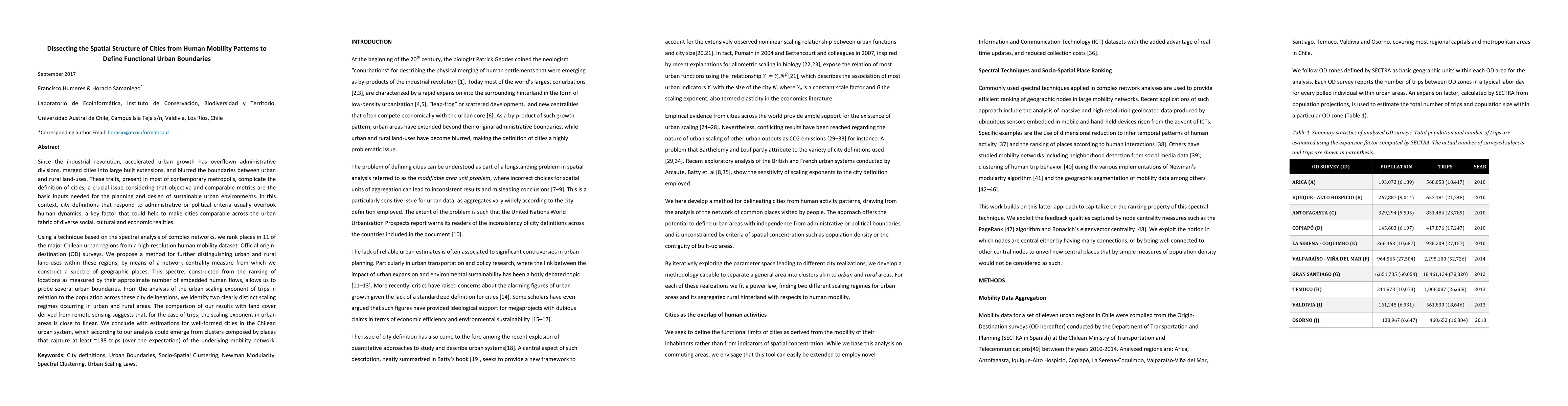 Since the industrial revolution, accelerated urban growth has overflown administrative divisions, merged cities into large built extensions, and blurred the boundaries between urban and rural land-uses. These traits, present in most of contemporary metropolis, complicate the definition of cities, a crucial issue considering that objective and comparable metrics are the basic inputs needed for the planning and design of sustainable urban environments. In this context, city definitions that respond to administrative or political criteria usually overlook human dynamics, a key factor that could help to make cities comparable across the urban fabric of diverse social, cultural and economic realities. Using a technique based on the spectral analysis of complex networks, we rank places in 11 of the major Chilean urban regions from a high-resolution human mobility dataset: Official origin-destination (OD) surveys. We propose a method for further distinguishing urban and rural land-uses within these regions, by means of a network centrality measure from which we construct a spectre of geographic places. This spectre, constructed from the ranking of locations as measured by their approximate number of embedded human flows, allows us to probe several urban boundaries. From the analysis of the urban scaling exponent of trips in relation to the population across these city delineations, we identify two clearly distinct scaling regimes occurring in urban and rural areas. The comparison of our results with land cover derived from remote sensing suggests that, for the case of trips, the scaling exponent in urban areas is close to linear. We conclude with estimations for well-formed cities in the Chilean urban system, which according to our analysis could emerge from clusters composed by places that capture at least ~138 trips (over the expectation) of the underlying mobility network.