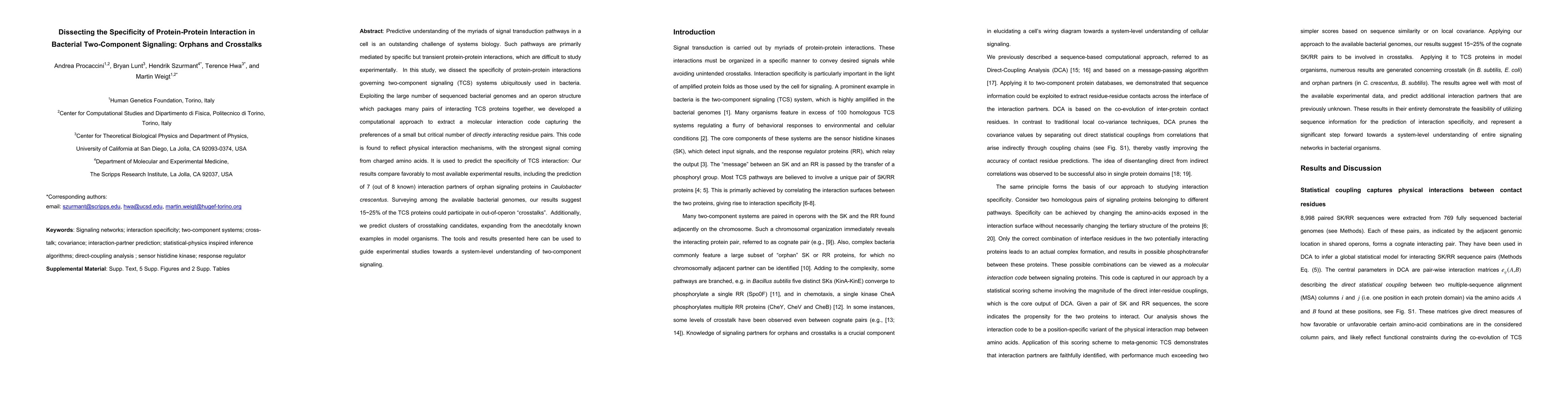 This study develops a computational approach to analyze the specificity of protein-protein interactions in bacterial two-component signaling systems, revealing that charged amino acids play a significant role. The approach predicts the interaction partners of orphan signaling proteins and identifies potential crosstalks among TCS proteins, suggesting 15-25% of TCS proteins may engage in such interactions beyond their operon.