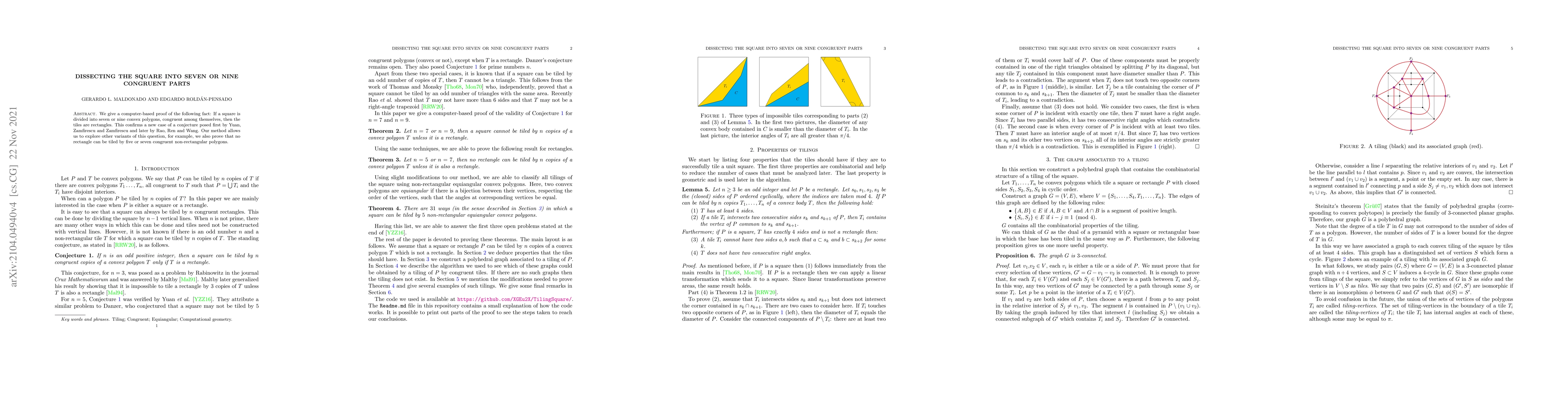 We give a computer-based proof of the following fact: If a square is divided into seven or nine convex polygons, congruent among themselves, then the tiles are rectangles.