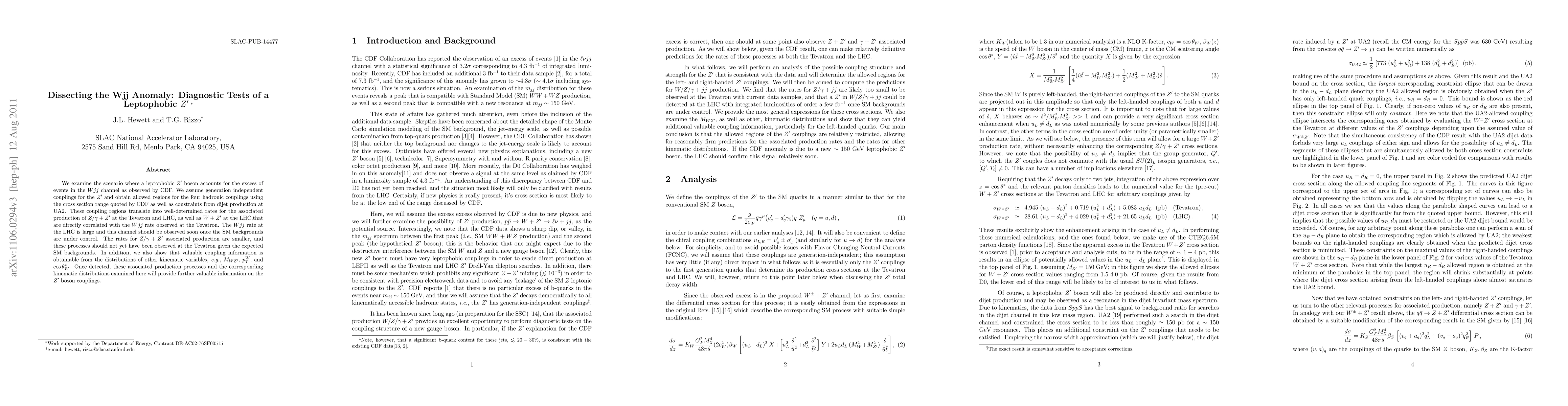 This paper investigates a leptophobic Z' boson as a potential explanation for the observed excess in the Wjj channel at CDF, determining allowed coupling regions and predicting associated production rates at the Tevatron and LHC. It highlights the significance of the Wjj channel for future LHC observations and the potential of kinematic distributions for further coupling insights once the Z' boson is detected.