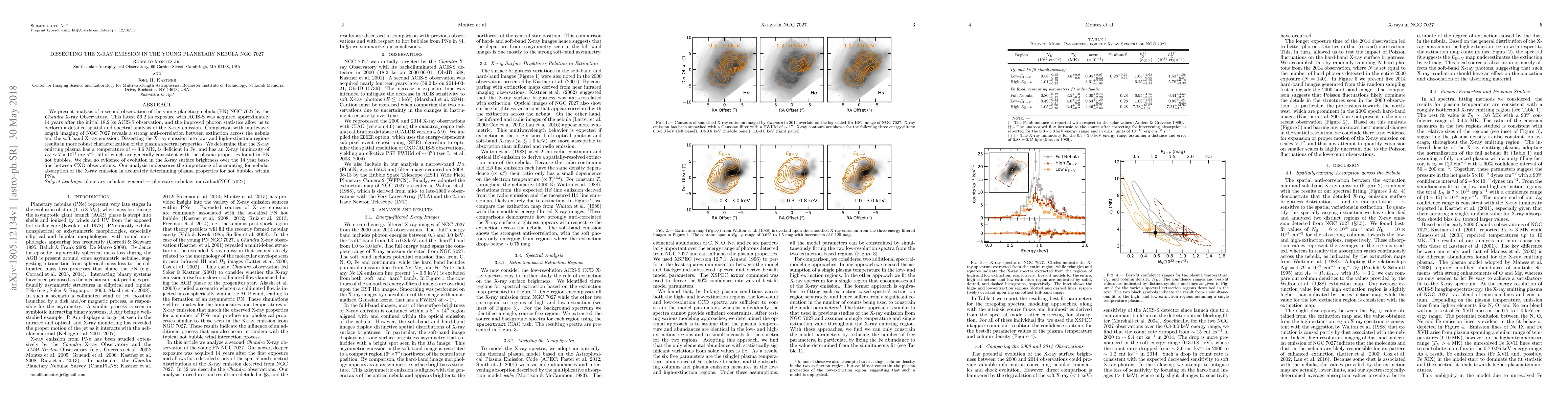 This paper analyzes a second Chandra X-ray Observatory observation of the planetary nebula NGC 7027, revealing a strong anti-correlation between extinction and soft X-ray emission. The X-ray plasma is characterized as having a temperature of ~3.6 MK and an X-ray luminosity of $7\times10^{31}$ erg s$^{-1}$, with no evidence of evolution over 14 years.