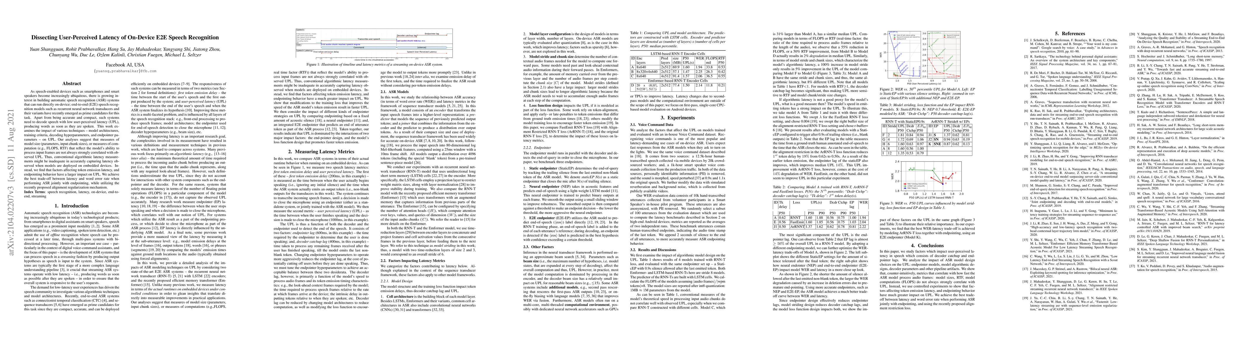 As speech-enabled devices such as smartphones and smart speakers become increasingly ubiquitous, there is growing interest in building automatic speech recognition (ASR) systems that can run directly on-device; end-to-end (E2E) speech recognition models such as recurrent neural network transducers and their variants have recently emerged as prime candidates for this task. Apart from being accurate and compact, such systems need to decode speech with low user-perceived latency (UPL), producing words as soon as they are spoken. This work examines the impact of various techniques - model architectures, training criteria, decoding hyperparameters, and endpointer parameters - on UPL. Our analyses suggest that measures of model size (parameters, input chunk sizes), or measures of computation (e.g., FLOPS, RTF) that reflect the model's ability to process input frames are not always strongly correlated with observed UPL. Thus, conventional algorithmic latency measurements might be inadequate in accurately capturing latency observed when models are deployed on embedded devices. Instead, we find that factors affecting token emission latency, and endpointing behavior have a larger impact on UPL. We achieve the best trade-off between latency and word error rate when performing ASR jointly with endpointing, while utilizing the recently proposed alignment regularization mechanism.
