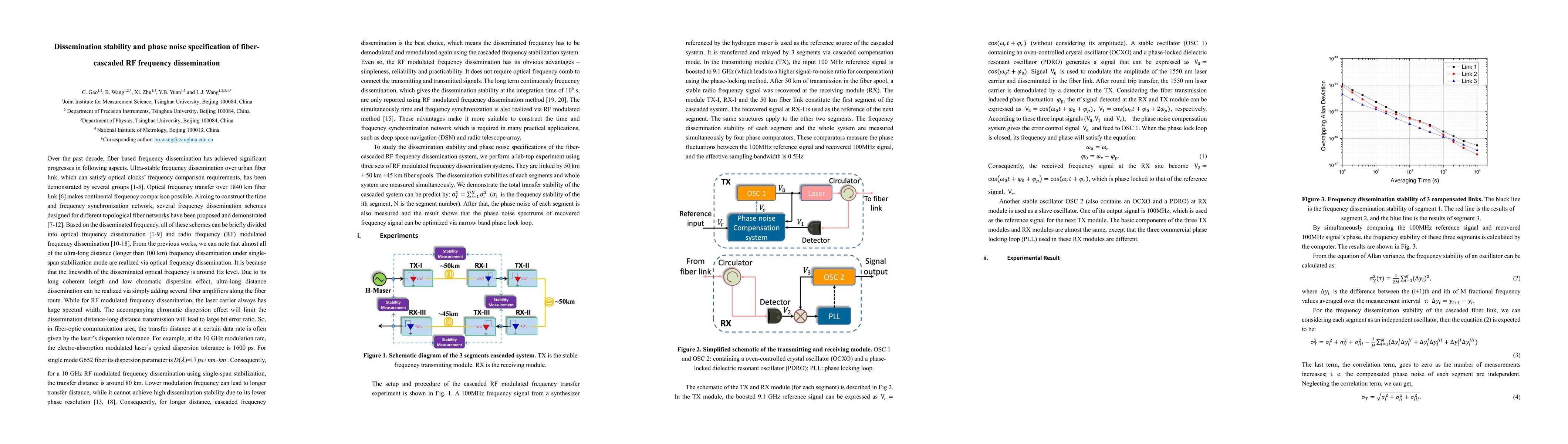 Over the past decade, fiber based frequency dissemination has achieved significant progresses in following aspects. To study the dissemination stability and phase noise specifications of the fiber-cascaded RF frequency dissemination system, we perform a lab-top experiment using three sets of RF modulated frequency dissemination systems. They are linked by 50 km + 50 km +45 km fiber spools. The dissemination stabilities of each segments and whole system are measured simultaneously. After that, the phase noise of each segment is also measured and the result shows that the phase noise spectrums of recovered frequency signal can be optimized via narrow band phase lock loop.