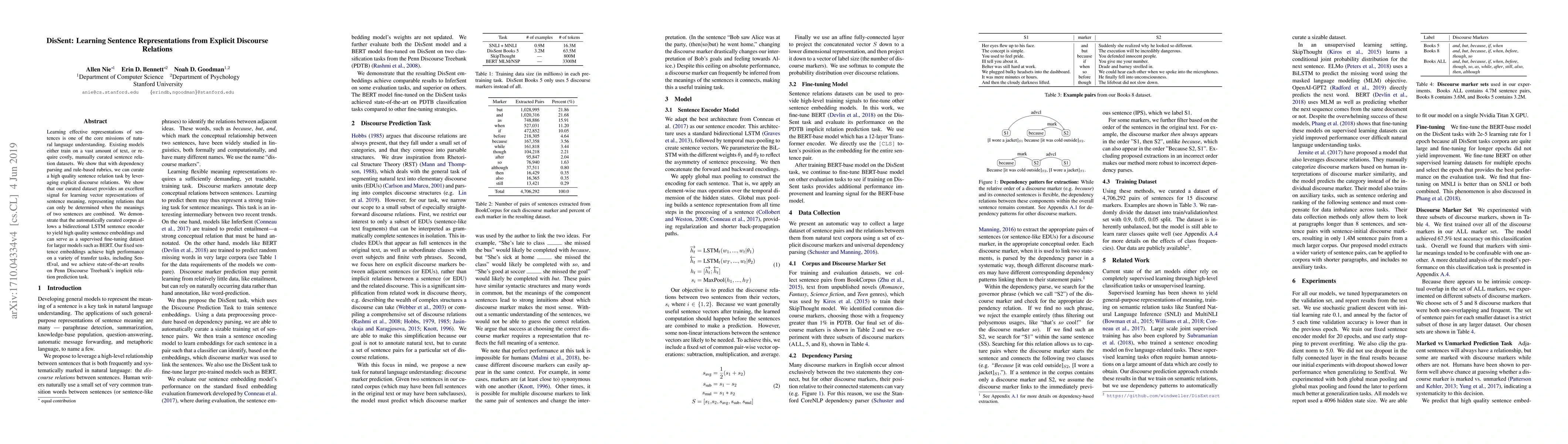 The paper introduces DisSent, a method for learning sentence representations using explicit discourse relations curated via dependency parsing and rule-based rubrics. The resulting embeddings from a bidirectional LSTM encoder perform well on transfer tasks and achieve state-of-the-art results on implicit relation prediction in the Penn Discourse Treebank.