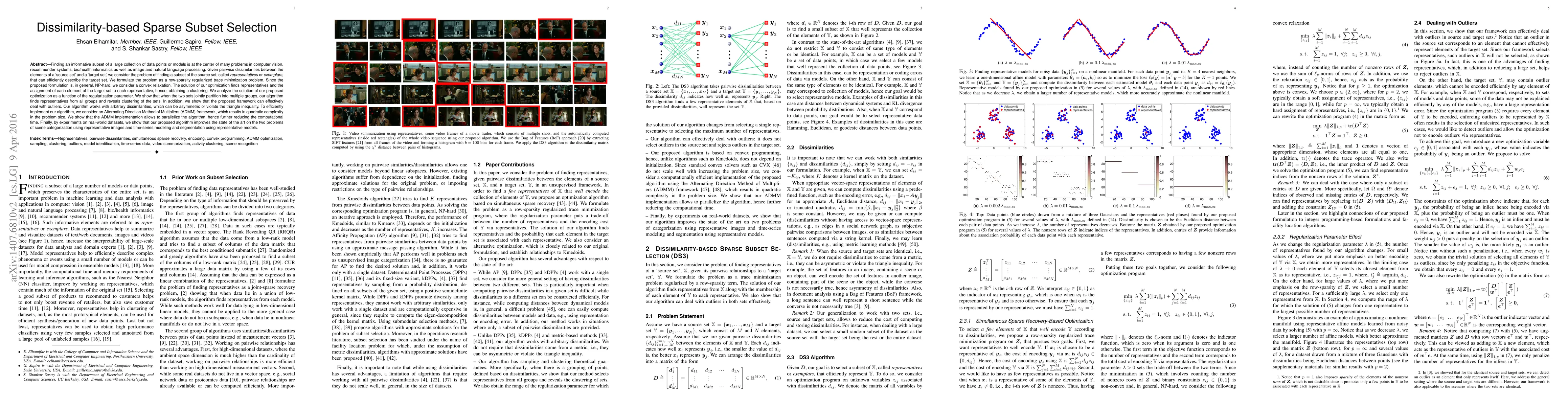 Finding an informative subset of a large collection of data points or models is at the center of many problems in computer vision, recommender systems, bio/health informatics as well as image and natural language processing. Given pairwise dissimilarities between the elements of a `source set' and a `target set,' we consider the problem of finding a subset of the source set, called representatives or exemplars, that can efficiently describe the target set. We formulate the problem as a row-sparsity regularized trace minimization problem. Since the proposed formulation is, in general, NP-hard, we consider a convex relaxation. The solution of our optimization finds representatives and the assignment of each element of the target set to each representative, hence, obtaining a clustering. We analyze the solution of our proposed optimization as a function of the regularization parameter. We show that when the two sets jointly partition into multiple groups, our algorithm finds representatives from all groups and reveals clustering of the sets. In addition, we show that the proposed framework can effectively deal with outliers. Our algorithm works with arbitrary dissimilarities, which can be asymmetric or violate the triangle inequality. To efficiently implement our algorithm, we consider an Alternating Direction Method of Multipliers (ADMM) framework, which results in quadratic complexity in the problem size. We show that the ADMM implementation allows to parallelize the algorithm, hence further reducing the computational time. Finally, by experiments on real-world datasets, we show that our proposed algorithm improves the state of the art on the two problems of scene categorization using representative images and time-series modeling and segmentation using representative~models.
