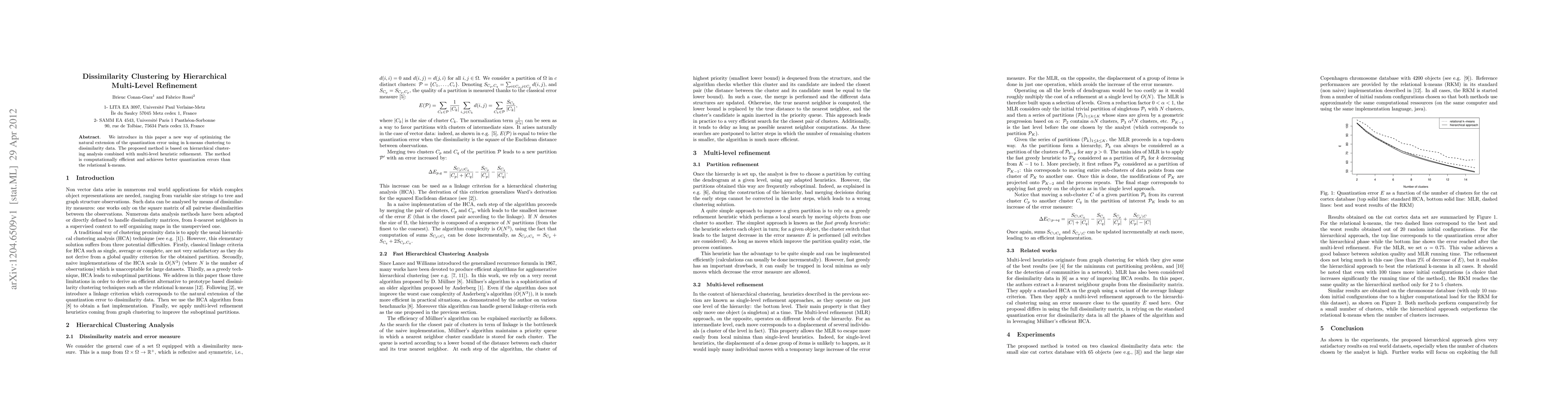 Summary: This paper presents a novel hierarchical clustering method that optimizes k-means clustering for dissimilarity data through multi-level refinement, achieving superior quantization error results and maintaining computational efficiency.