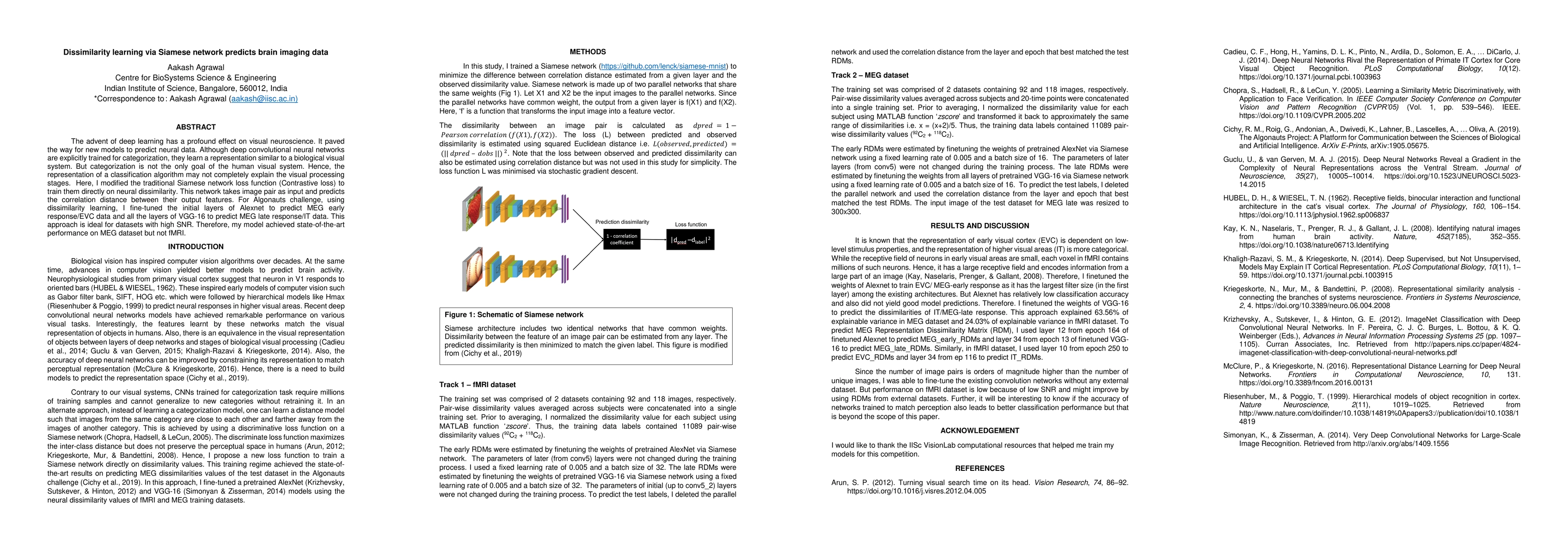 The advent of deep learning has a profound effect on visual neuroscience. It paved the way for new models to predict neural data. Although deep convolutional neural networks are explicitly trained for categorization, they learn a representation similar to a biological visual system. But categorization is not the only goal of the human visual system. Hence, the representation of a classification algorithm may not completely explain the visual processing stages. Here, I modified the traditional Siamese network loss function (Contrastive loss) to train them directly on neural dissimilarity. This network takes image pair as input and predicts the correlation distance between their output features. For Algonauts challenge, using dissimilarity learning, I fine-tuned the initial layers of Alexnet to predict MEG early response/EVC data and all the layers of VGG-16 to predict MEG late response/IT data. This approach is ideal for datasets with high SNR. Therefore, my model achieved state-of-the-art performance on MEG dataset but not fMRI.