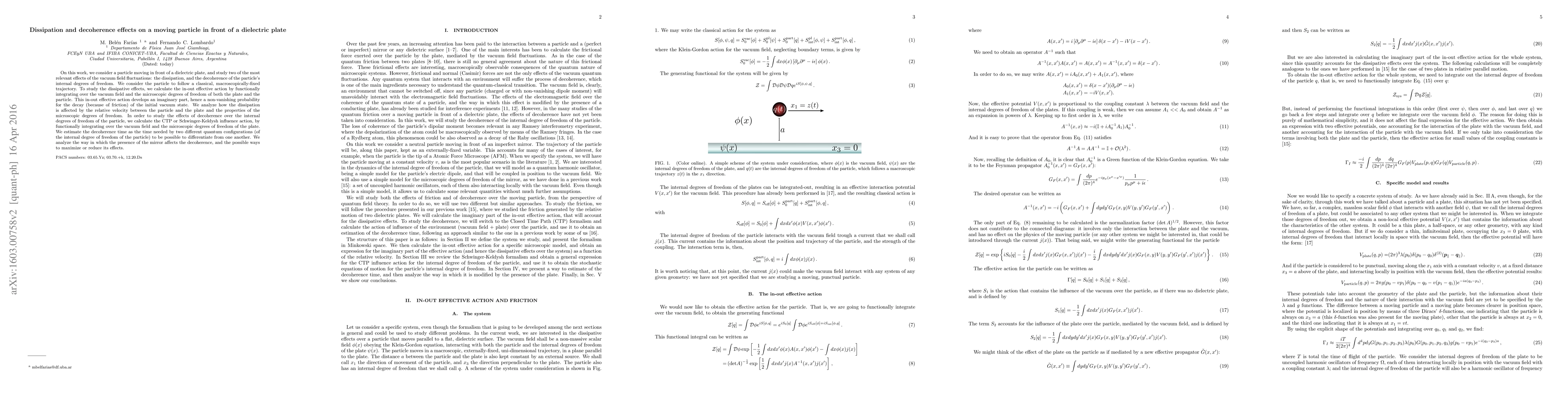 On this work, we consider a particle moving in front of a dielectric plate, and study two of the most relevant effects of the vacuum field fluctuations: the dissipation, and the decoherence of the particle's internal degrees of freedom. We consider the particle to follow a classical, macroscopically-fixed trajectory. To study the dissipative effects, we calculate the in-out effective action by functionally integrating over the vacuum field and the microscopic degrees of freedom of both the plate and the particle. This in-out effective action develops an imaginary part, hence a non-vanishing probability for the decay (because of friction) of the initial vacuum state. We analyze how the dissipation is affected by the relative velocity between the particle and the plate and the properties of the microscopic degrees of freedom. In order to study the effects of decoherence over the internal degrees of freedom of the particle, we calculate the CTP or Schwinger-Keldysh influence action, by functionally integrating over the vacuum field and the microscopic degrees of freedom of the plate. We estimate the decoherence time as the time needed by two different quantum configurations (of the internal degree of freedom of the particle) to be possible to differentiate from one another. We analyze the way in which the presence of the mirror affects the decoherence, and the possible ways to maximize or reduce its effects.