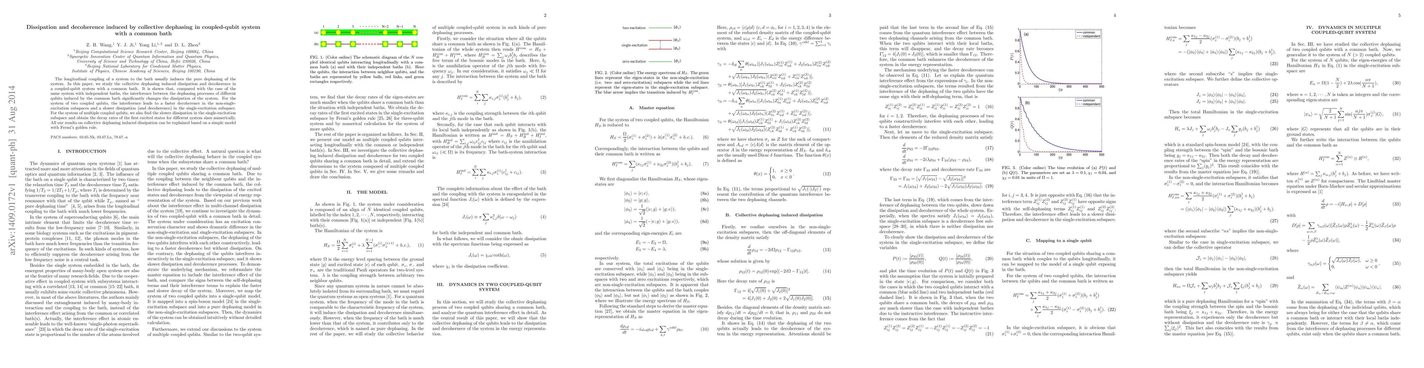 This paper investigates how collective dephasing in a coupled-qubit system with a common bath affects dissipation and decoherence. It finds that interference from the common bath alters dissipation rates, leading to faster decoherence in non-single-excitation subspaces and slower dissipation in single-excitation subspaces, with numerical results for multiple qubits.