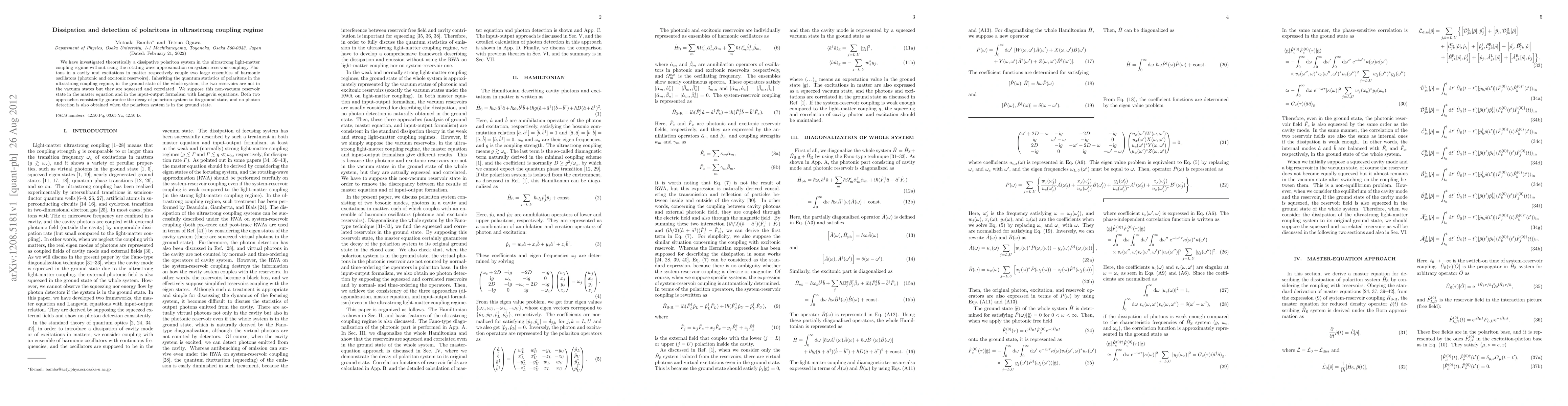 This paper theoretically explores the dissipation and detection of polaritons in the ultrastrong coupling regime, revealing that the photonic and excitonic reservoirs are squeezed and correlated in the ground state. Both the master equation and input-output formalism with Langevin equations show consistent decay to the ground state without photon detection.