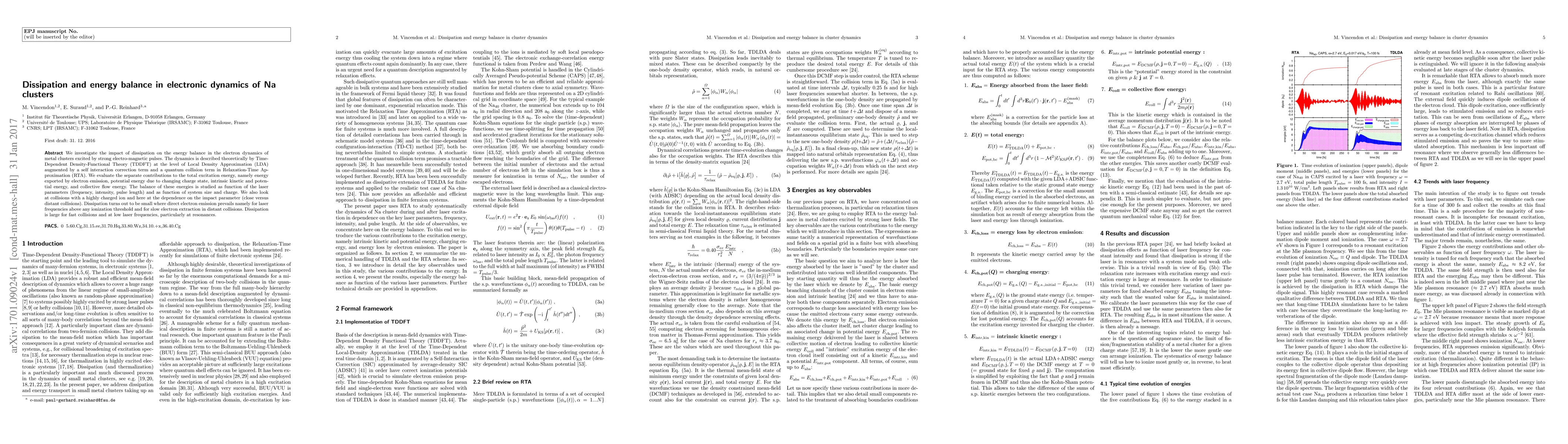 This paper examines the energy balance in the electronic dynamics of Na clusters under strong electromagnetic pulses, using TDDFT with LDA and RTA. It finds that dissipation is minimal for high-frequency lasers and distant collisions, but significant for low-frequency lasers and fast, close collisions.