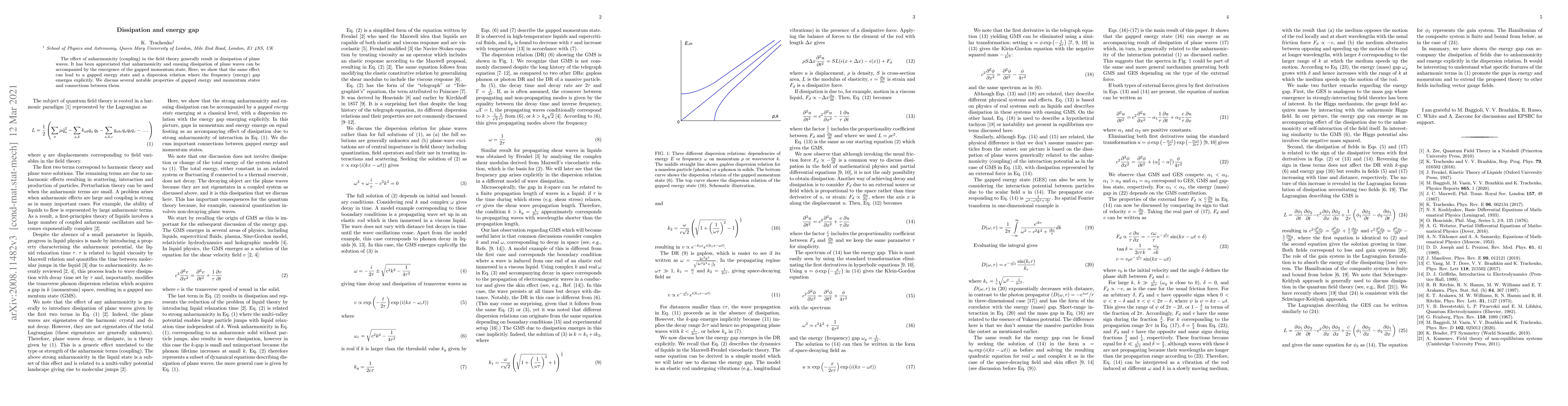 The effect of anharmonicity (coupling) in the field theory generally result in dissipation of plane waves. It has been appreciated that anharmonicity and ensuing dissipation of plane waves can be accompanied by the emergence of the gapped momentum state. Here, we show that the same effect can lead to a gapped energy state and a dispersion relation where the frequency (energy) gap emerges explicitly. We discuss several notable properties of gapped energy and momentum states and connections between them.