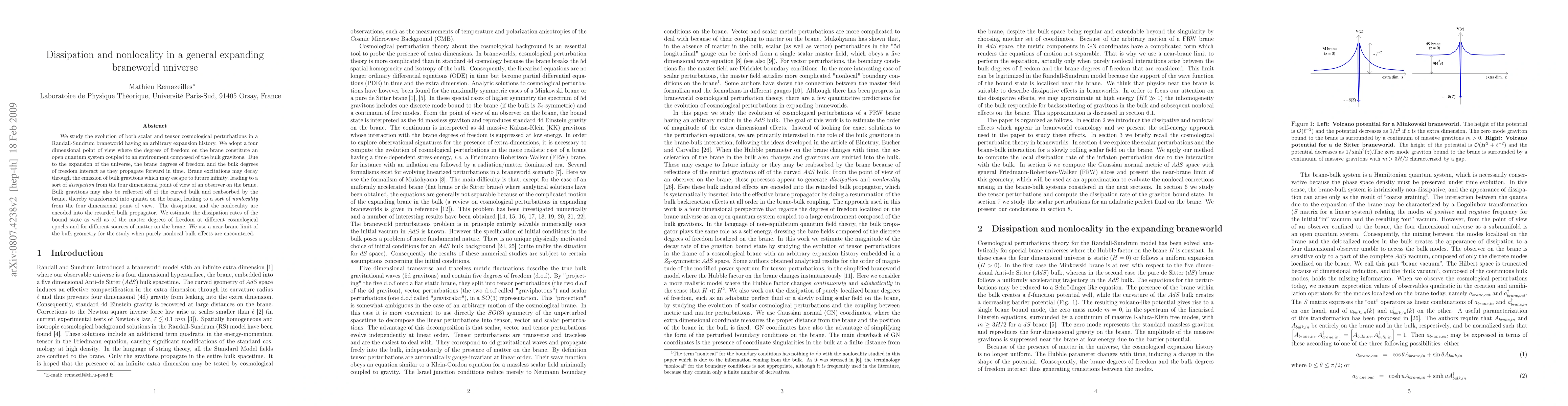 We study the evolution of both scalar and tensor cosmological perturbations in a Randall-Sundrum braneworld having an arbitrary expansion history. We adopt a four dimensional point of view where the degrees of freedom on the brane constitute an open quantum system coupled to an environment composed of the bulk gravitons. Due to the expansion of the universe, the brane degrees of freedom and the bulk degrees of freedom interact as they propagate forward in time. Brane excitations may decay through the emission of bulk gravitons which may escape to future infinity, leading to a sort of dissipation from the four dimensional point of view of an observer on the brane. Bulk gravitons may also be reflected off of the curved bulk and reabsorbed by the brane, thereby transformed into quanta on the brane, leading to a sort of nonlocality from the four dimensional point of view. The dissipation and the nonlocality are encoded into the retarded bulk propagator. We estimate the dissipation rates of the bound state as well as of the matter degrees of freedom at different cosmological epochs and for different sources of matter on the brane. We use a near-brane limit of the bulk geometry for the study when purely nonlocal bulk effects are encountered.