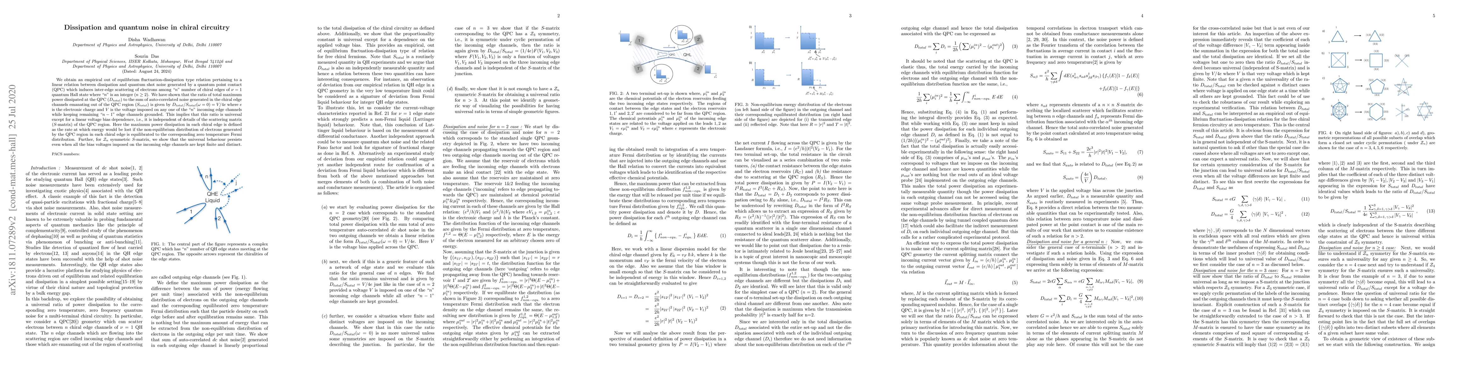 We obtain an empirical relation between the zero temperature, zero frequency quantum noise ${\small{(}}S{\small{(}}\omega=0{\small{)}}{\small{)}}$ and the related power dissipation ${\small{(}}D{\small{)}}$ for chiral circuitry. We consider the case of single quantum point contact (QPC) which induces inter-edge scattering of electrons among $"n"$ number of chiral edges of $\nu=1$ quantum Hall state. The ratio of total maximum power dissipation generated at the QPC ($D_{total}$) to the sum of auto-correlated noise generated in the chiral edge channels emanating out of the QPC region ($S_{total}$) is shown to be, $D_{total}/S_{total}{\small{(}}\omega=0{\small{)}} = V/{\small{}}4 e{\small{}}$ where $e$ is the electronic charge and $V$ is the voltage imposed on any one of the "$n$" incoming edge channels while keeping remaining "$n-1$" edge channels grounded. This implies that this ratio is universal except for a linear voltage bias dependence, i.e., it is independent of details of the scattering matrix ($S$-matrix) of the QPC region. Here the maximum power dissipation in each chiral edge is defined as the rate at which energy would be lost if the non-equilibrium distribution of electrons generated by the QPC region in each chiral edge is equilibrated to the corresponding zero temperature Fermi distribution. Further, for ${\cal Z}_n$ symmetric $S$-matrix, we show that the universal behaviour persists even when all the bias voltages imposed on the incoming edge channels are kept finite and distinct.