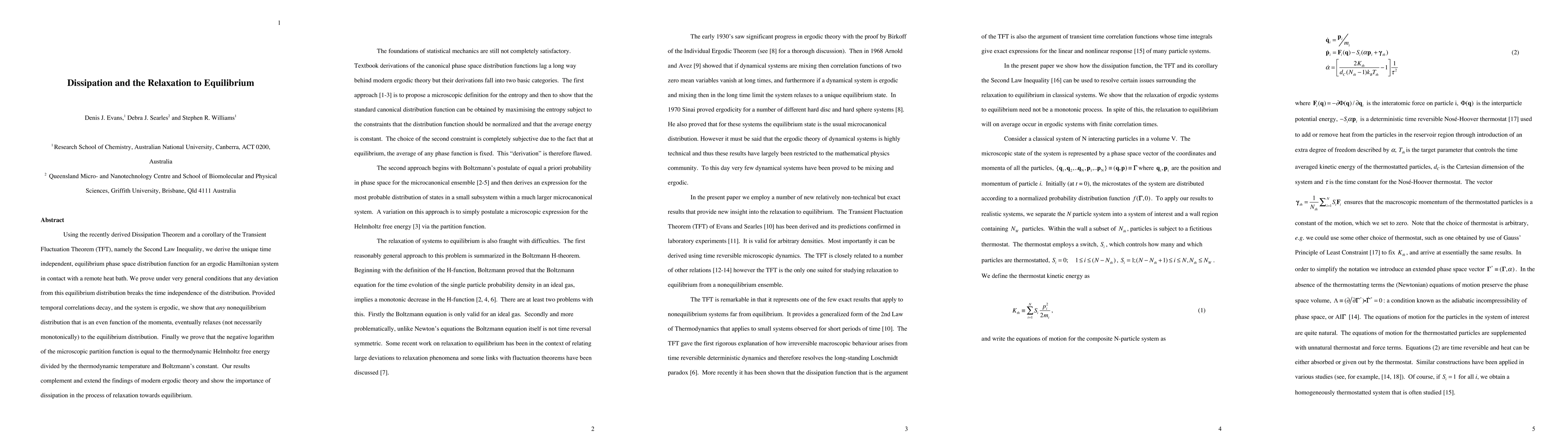Using the recently derived Dissipation Theorem and a corollary of the Transient Fluctuation Theorem (TFT), namely the Second Law Inequality, we derive the unique time independent, equilibrium phase space distribution function for an ergodic Hamiltonian system in contact with a remote heat bath. We prove under very general conditions that any deviation from this equilibrium distribution breaks the time independence of the distribution. Provided temporal correlations decay, and the system is ergodic, we show that any nonequilibrium distribution that is an even function of the momenta, eventually relaxes (not necessarily monotonically) to the equilibrium distribution. Finally we prove that the negative logarithm of the microscopic partition function is equal to the thermodynamic Helmholtz free energy divided by the thermodynamic temperature and Boltzmann's constant. Our results complement and extend the findings of modern ergodic theory and show the importance of dissipation in the process of relaxation towards equilibrium.