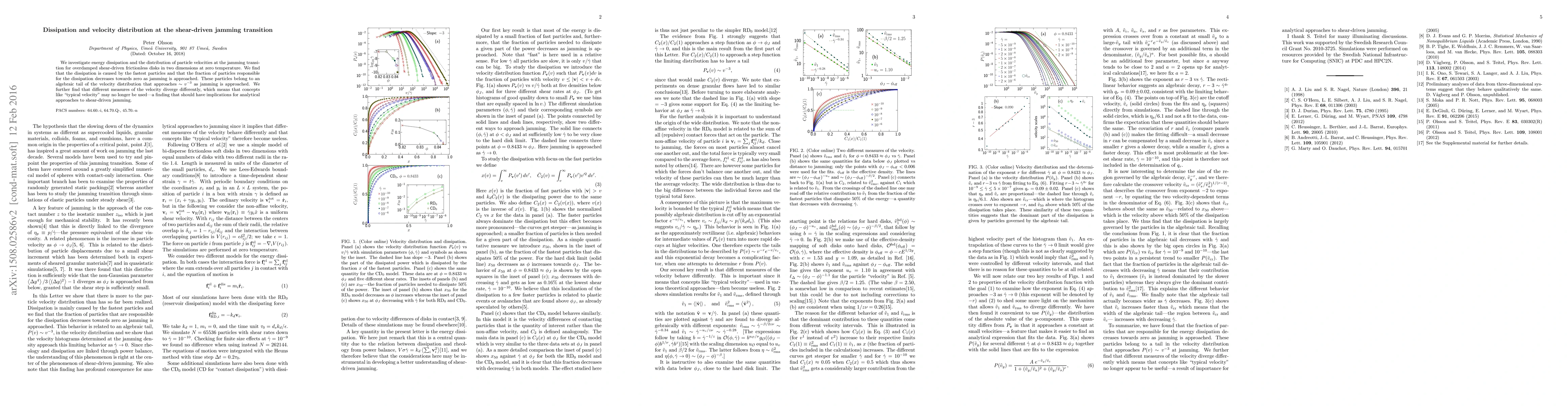 We investigate energy dissipation and the distribution of particle velocities at the jamming transition for overdamped shear-driven frictionless disks in two dimensions at zero temperature. We find that the dissipation is caused by the fastest particles and that the fraction of particles responsible for the dissipation decreases towards zero as jamming is approached. These particles belong to an algebraic tail of the velocity distribution that approaches $\sim v^{-3}$ as jamming is approached. We further find that different measures of the velocity diverge differently, which means that concepts like "typical velocity" may no longer be used---a finding that should have implications for analytical approaches to shear-driven jamming.