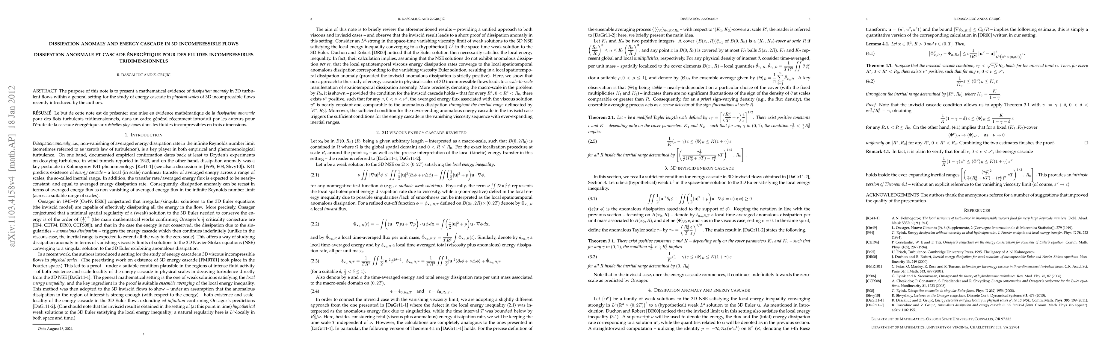 Summary: This paper provides mathematical evidence of dissipation anomaly in 3D turbulent flows, supporting the study of energy cascade in physical scales of 3D incompressible flows, as introduced by the authors. The findings contribute to a deeper understanding of turbulence dynamics.