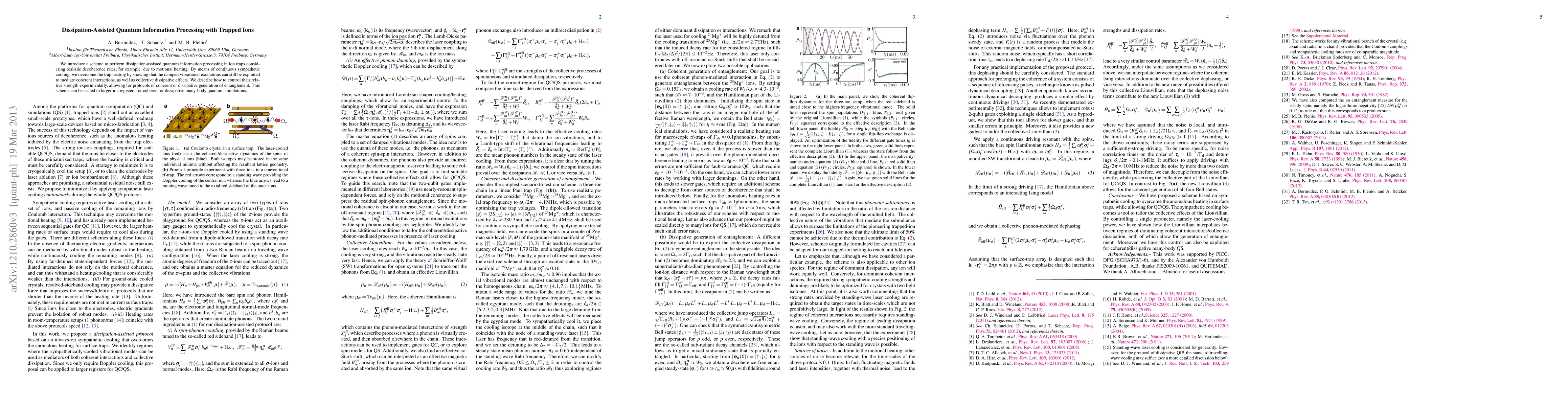 This paper proposes a method for dissipation-assisted quantum information processing in trapped ions, overcoming decoherence from motional heating through sympathetic cooling. The scheme leverages damped vibrational excitations to mediate coherent interactions and collective dissipative effects, enabling scalable protocols for entanglement generation and many-body quantum simulations.