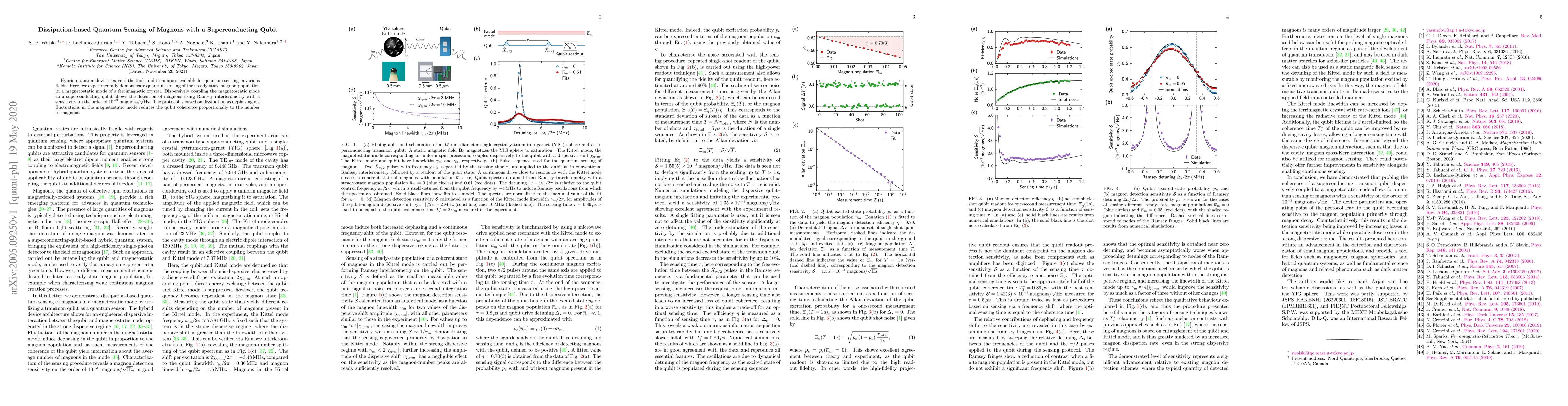 This paper demonstrates quantum sensing of magnons in a ferrimagnetic crystal using a superconducting qubit coupled to a magnetostatic mode, achieving sensitivity of $10^{-3}$ magnons/$\sqrt{\text{Hz}}$ through dissipation-based dephasing. The method employs Ramsey interferometry for detection.