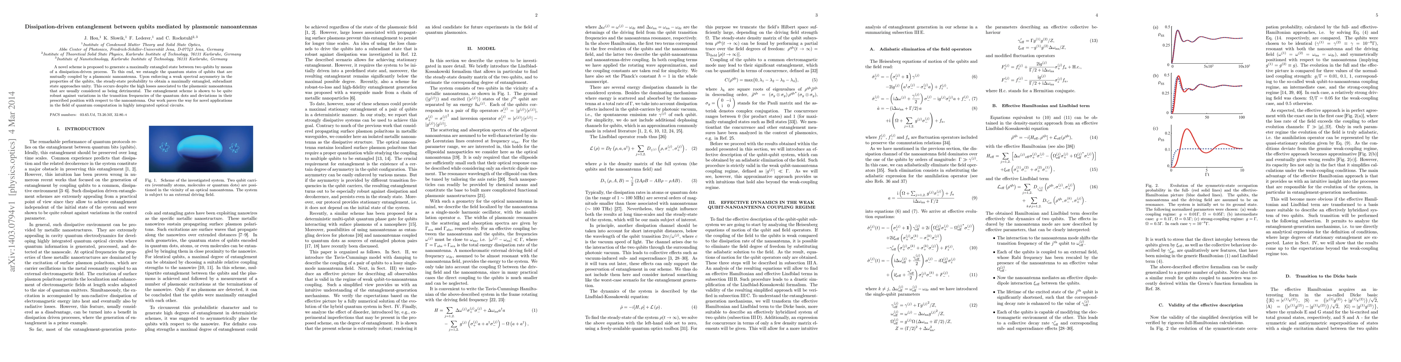 A novel scheme is proposed to generate a maximally entangled state between two qubits by means of a dissipation-driven process. To this end, we entangle the quantum states of qubits that are mutually coupled by a plasmonic nanoantenna. Upon enforcing a weak spectral asymmetry in the properties of the qubits, the steady-state probability to obtain a maximally entangled, subradiant state approaches unity. This occurs despite the high losses associated to the plasmonic nanoantenna that are usually considered as being detrimental. The entanglement scheme is shown to be quite robust against variations in the transition frequencies of the quantum dots and deviations in their prescribed position with respect to the nanoantenna. Our work paves the way for novel applications in the field of quantum computation in highly integrated optical circuits.