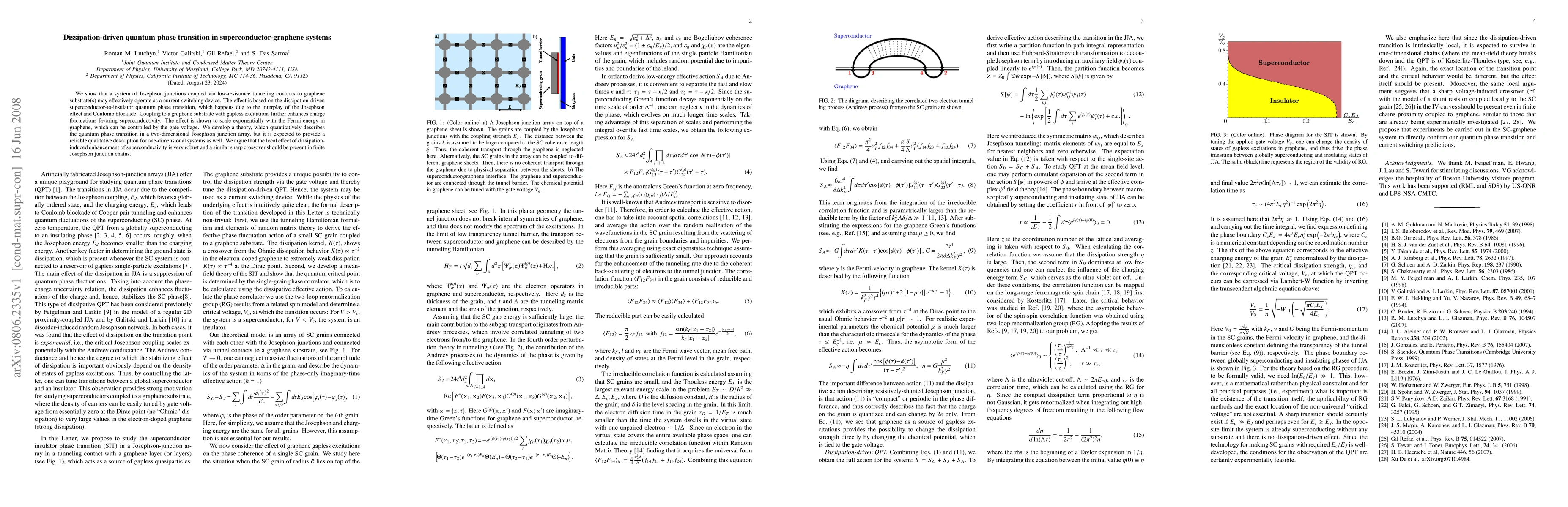 This paper demonstrates that Josephson junctions coupled to graphene via low-resistance contacts can function as current switching devices due to a dissipation-driven superconductor-to-insulator quantum phase transition. The transition is influenced by the interplay of the Josephson effect and Coulomb blockade, with graphene's gapless excitations enhancing superconductivity, which scales exponentially with the Fermi energy controlled by gate voltage.