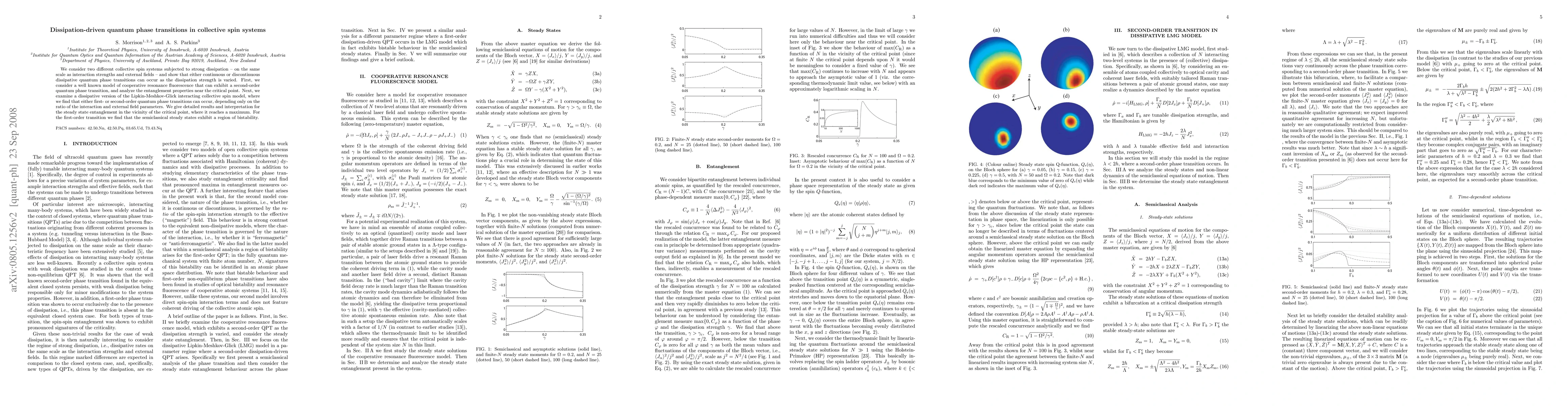 We consider two different collective spin systems subjected to strong dissipation -- on the same scale as interaction strengths and external fields -- and show that either continuous or discontinuous dissipative quantum phase transitions can occur as the dissipation strength is varied. First, we consider a well known model of cooperative resonance fluorescence that can exhibit a second-order quantum phase transition, and analyze the entanglement properties near the critical point. Next, we examine a dissipative version of the Lipkin-Meshkov-Glick interacting collective spin model, where we find that either first- or second-order quantum phase transitions can occur, depending only on the ratio of the interaction and external field parameters. We give detailed results and interpretation for the steady state entanglement in the vicinity of the critical point, where it reaches a maximum. For the first-order transition we find that the semiclassical steady states exhibit a region of bistability.