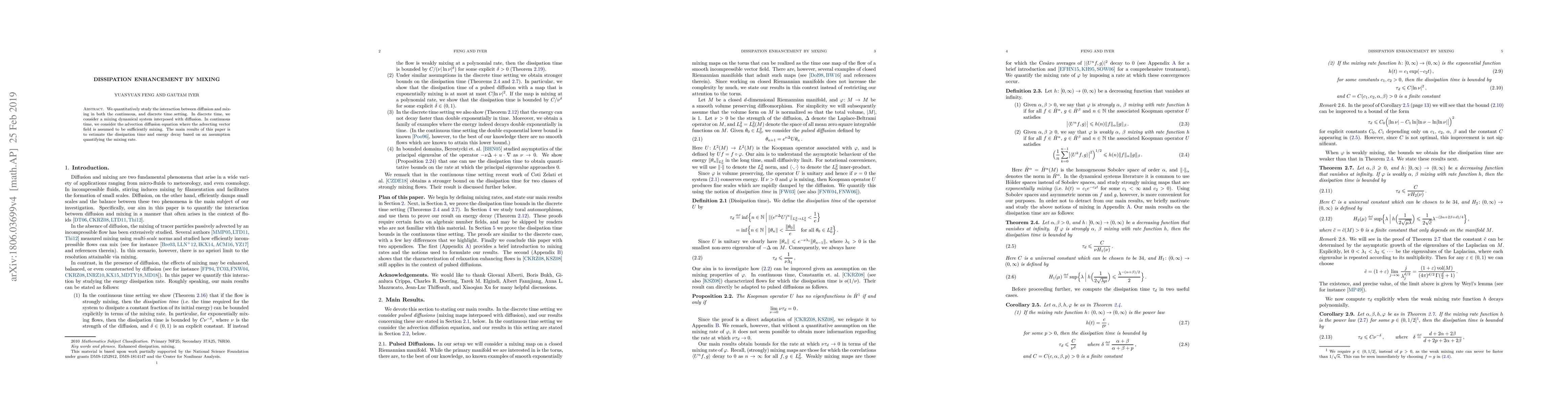 We quantitatively study the interaction between diffusion and mixing in both the continuous, and discrete time setting. In discrete time, we consider a mixing dynamical system interposed with diffusion. In continuous time, we consider the advection diffusion equation where the advecting vector field is assumed to be sufficiently mixing. The main results of this paper estimate the dissipation time and energy decay based on an assumption quantifying the mixing rate.