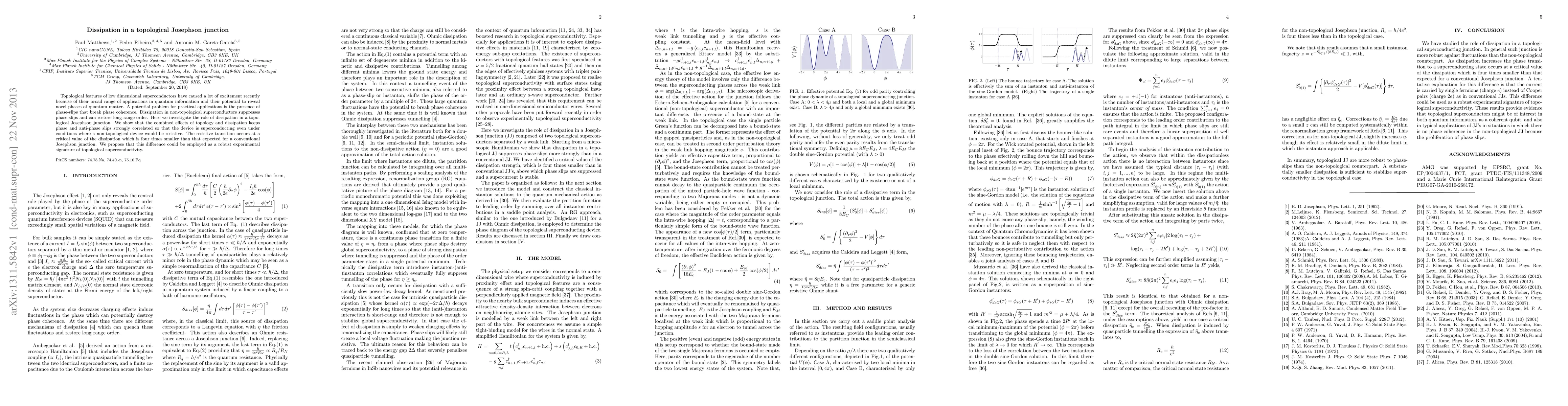 This paper investigates how dissipation in a topological Josephson junction maintains superconductivity by preventing phase-slips, demonstrating that the resistive transition occurs at a significantly lower dissipation level compared to conventional junctions, suggesting a potential experimental signature of topological superconductivity.