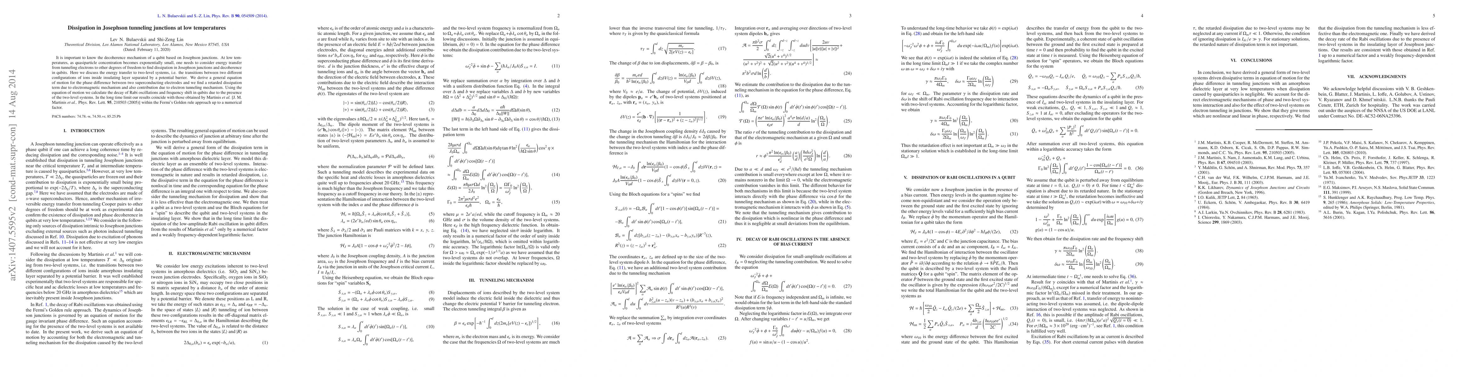This paper investigates the dissipation mechanisms in Josephson tunneling junctions at low temperatures, focusing on energy transfer to two-level systems. It derives an equation of motion for the phase difference and finds a retarded dissipation term, calculating the decay of Rabi oscillations and frequency shifts in qubits due to these systems.